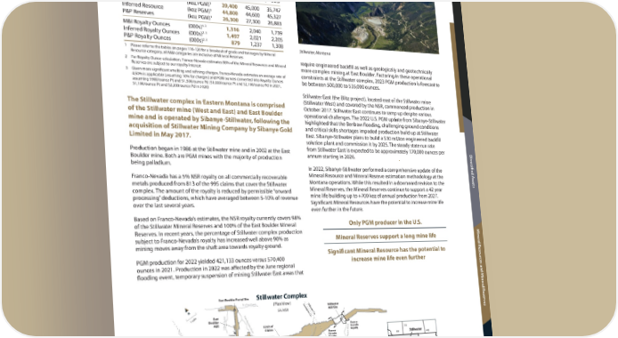 41 Franco-Nevada Corporation TSX / NYSE: FNV United States Mineral Resources and Mineral Reserves Additional Information Diversified Assets Stillwater Wyoming Washington BC AB SK MB North Dakota Nebraska Nevada Oregon Idaho Utah California Colorado Montana South Dakota Stillwater Location: Montana, United States Operator: Sibanye-Stillwater Precious Metals: PGM Royalty: NSR: 5% N Stillwater Complex (Plan View) 5% NSR Franco-Nevada Royalty Land Franco- Nevada Royalty Franco- Nevada Royalty East Boulder Portal Site East Boulder Adit Stillwater Mill Site Camp Lake Boulder River East Boulder River Dry Fork Creek Lewis Gulch West Fork Stillwater Stillwater River Limit of Claims Sweetgrass Co. Park Co. Stillwater Co. Sweetgrass Co. 1 mile County line Stillwater Complex (Long Section) Not to scale Current and future planned production layouts Non-Royalty mill area Stillwater East (Blitz) Stillwater West East Boulder Mine require engineered backfill as well as geologically and geotechnically more complex mining at East Boulder. Factoring in these operational constraints at the Stillwater complex, 2023 PGM production is forecast to be between 500,000 to 535,000 ounces. Stillwater East (the Blitz project), located east of the Stillwater mine (Stillwater West) and covered by the NSR, commenced production in October 2017. Stillwater East continues to ramp up despite various operational challenges. The 2022 U.S. PGM update from Sibanye-Stillwater highlighted that the Benbow flooding, challenging ground conditions and critical skills shortages impeded production build up at Stillwater East. Sibanye-Stillwater plans to build a $30 million engineered backfill solution plant and commission it by 2025. The steady state run rate from Stillwater East is expected to be approximately 170,000 ounces per annum starting in 2026. In 2022, Sibanye-Stillwater performed a comprehensive update of the Mineral Resource and Mineral Reserve estimation methodology at the Montana operations. While this resulted in a downward revision to the Mineral Reserves, the Mineral Reserves continue to support a 42 year mine life building up to +700 koz of annual production from 2027. Significant Mineral Resources have the potential to increase mine life even further in the future. Only PGM producer in the U.S. Mineral Reserves support a long mine life Significant Mineral Resource has the potential to increase mine life even further 2022 2021 2020 Revenue to Franco-Nevada ($ million) $ 36.8 $ 57.8 $ 50.9 M&I Resource (koz PGM) 1 39,400 45,000 35,747 Inferred Resource (koz PGM) 1 44,800 44,600 45,327 P&P Reserves (koz PGM) 1 26,300 27,300 26,883 M&I Royalty Ounces (000s) 1, 3 1,316 2,040 1,739 Inferred Royalty Ounces (000s) 2, 3 1,497 2,021 2,205 P&P Royalty Ounces (000s) 2, 3 879 1,237 1,308 1 Please refer to the tables on pages 116-120 for a breakout of grade and tonnages by Mineral Resource category; all M&I categories are inclusive of Mineral Reserves 2 For Royalty Ounce calculation, Franco-Nevada estimates 98% of the Mineral Resources and Mineral Reserves are subject to our royalty interest 3 Given more significant smelting and refining charges, Franco-Nevada estimates an average rate of 4.50% is applicable (assuming 10% for charges) and PGM ounces converted into Royalty Ounces assuming $900/ounce Pt and $1,500/ounce Pd ($1,000/ounce Pt and $2,100/ounce Pd in 2021, $1,100/ounce Pt and $2,200/ounce Pd in 2020) The Stillwater complex in Eastern Montana is comprised of the Stillwater mine (West and East) and East Boulder mine and is operated by Sibanye-Stillwater, following the acquisition of Stillwater Mining Company by Sibanye Gold Limited in May 2017. Production began in 1986 at the Stillwater mine and in 2002 at the East Boulder mine. Both are PGM mines with the majority of production being palladium. Franco-Nevada has a 5% NSR royalty on all commercially recoverable metals produced from 813 of the 995 claims that cover the Stillwater complex. The amount of the royalty is reduced by permissible “onward processing” deductions, which have averaged between 5-10% of revenue over the last several years. Based on Franco-Nevada’s estimates, the NSR royalty currently covers 98% of the Stillwater Mineral Reserves and 100% of the East Boulder Mineral Reserves. In recent years, the percentage of Stillwater complex production subject to Franco-Nevada’s royalty has increased well above 90% as mining moves away from the shaft area towards royalty ground. PGM production for 2022 yielded 421,133 ounces versus 570,400 ounces in 2021. Production in 2022 was affected by the June regional flooding event, temporary suspension of mining Stillwater East areas that Stillwater, Montana