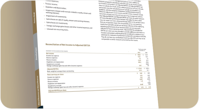 Additional Information Non-GAAP Financial Measures w vie er Adjusted EBITDA and Adjusted EBITDA per Share Management uses Adjusted EBITDA and Adjusted EBITDA per share to v O evaluate the underlying operating performance of Franco-Nevada as a Adjusted EBITDA and Adjusted EBITDA per share are non-GAAP financial whole for the reporting periods presented, to assist with the planning and measures, which is defined by Franco-Nevada by excluding the following forecasting of future operating results, and to supplement information from net income (loss) and earnings (loss) per share (“EPS”): in its financial statements. Management believes that in addition to • Income tax expense/recovery; measures prepared in accordance with IFRS such as net income and EPS, our investors and analysts use Adjusted EBITDA and Adjusted EBITDA per • Finance expenses; share to evaluate the results of the underlying business of Franco-Nevada, • Finance income; particularly since the excluded items are typically not included in our guidance, with the exception of depletion and depreciation expense. • Depletion and depreciation; While the adjustments to net income and EPS in these measures include • Impairment charges and reversals related to royalty, stream and items that are both recurring and non-recurring, management believes working interests; that Adjusted EBITDA and Adjusted EBITDA per share are useful measures etals • Impairment of investments; of Franco-Nevada’s performance because they adjust for items which may not relate to or have a disproportionate effect on the period in which • Gains/losses on sale of royalty, stream and working interests; they are recognized, impact the comparability of our core operating ecious M • Gains/losses on investments; results from period to period, are not always reflective of the underlying r operating performance of our business and/or are not necessarily P • Foreign exchange gains/losses and other income/expenses; and indicative of future operating results. Adjusted EBITDA and Adjusted • Unusual non-recurring items. EBITDA per share are only intended to provide additional information to investors and analysts and should not be considered in isolation or as a substitute for measures of performance prepared in accordance with IFRS. They do not have any standardized meaning under IFRS and may not be comparable to similar measures presented by other issuers. Reconciliation of Net Income to Adjusted EBITDA For the year ended December 31, ssets (expressed in millions, except per share amounts) 2022 2021 Net income $ 700.6 $ 733.7 ersified A Income tax expense 133.1 124.1 iv Finance expenses 3.2 3.6 D Finance income (12.6) (3.7) Depletion and depreciation 286.2 299.6 Impairment reversals – (68.0) Foreign exchange (gain) loss and other (income) expenses (3.6) 3.0 Adjusted EBITDA $ 1,106.9 $ 1,092.3 Basic weighted average shares outstanding 191.5 191.1 Basic earnings per share $ 3.66 $ 3.84 es Income tax expense 0.70 0.65 v eser Finance expenses 0.02 0.02 al R Finance income (0.07) (0.02) Depletion and depreciation 1.49 1.57 iner Impairment reversals – (0.36) Foreign exchange (gain) loss and other (income) expenses (0.02) 0.02 es and M Adjusted EBITDA per share $ 5.78 $ 5.72 c esour al R iner M tion orma nf dditional I A 128 Franco-Nevada Corporation TSX / NYSE: FNV