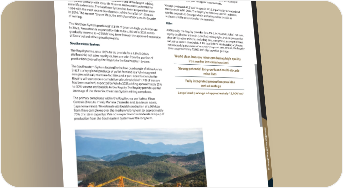 Iron Ore Northern System Sossego The Royalty terms, on a 100% basis, provide for a 1.8% (0.264% The Royalty also provides for a 2.5% (0.367% attributable) net sales attributable) net sales royalty on iron ore sales from the Northern royalty on certain copper and gold assets. The Royalty applies on a 50% System mines. basis (i.e. 1.25% of net sales, 0.183% attributable) to Sossego, reflecting Vale’s ownership at the time of issuance. Sossego is located in Carajas, The Northern System located in Carajas, Para state, Brazil is a fully Para state, Brazil and is an open pit operation with nominal capacity of integrated operation inclusive of mines, railroad, maritime facilities and approximately 93 kt per year of copper in concentrate. a port. The Northern System includes the Serra Sul (i.e. S11A-D), Serra Norte and Serra Leste mines and represents one of the largest mining Sossego produced 43.2 kt of copper in 2022, impacted by extended mill complexes globally with long-life reserves and excellent potential for maintenance in H1 2022. The Royalty further covers certain adjacent mine life extensions. The Northern System has been in operation since satellite deposits to Sossego which are being studied by Vale as 1984 with the most recent development of the Serra Sul (S11D) mine replacement/life extensions for the operation. in 2016. The current reserve life at the complex supports multi-decades of mining. Other The Northern System produced 172 Mt of premium high-grade iron ore Additionally, the Royalty provides for a 1% (0.147% attributable) net sales in 2022. Production is expected by Vale to be c.180 Mt in 2023 and to royalty on all other minerals (specified mining rights include prospective gradually increase to +220 Mt long term through the approved expansion deposits for other minerals including zinc, manganese, amongst others), of Serra Sul and other growth projects. subject to certain thresholds. A 1% rate (0.147% attributable) applies to net proceeds in the event of an underlying asset sale. In total, the Royalty 2 Southeastern System covers approximately 15,000 km of prospective geology. The Royalty terms, on a 100% basis, provide for a 1.8% (0.264% World class iron ore mines producing high quality attributable) net sales royalty on iron ore sales from the portion of iron ore for low emission steel production covered by the Royalty in the Southeastern System. The Southeastern System located in the Iron Quadrangle of Minas Gerais, Strong potential for growth and multi-decade Brazil is a key global producer of pellet feed and is a fully integrated mine lives complex with rail, maritime facilities and a port. Contributions to the Fully integrated production provides Royalty will start once a cumulative sales threshold of 1.7 Bt of iron ore has been reached, expected by Vale in 2025, adding approximately 25% cost advantage to 30% volume attributable to the Royalty. The Royalty provides partial coverage of the three Southeastern System mining complexes. 2 Large land package of approximately 15,000 km The primary complexes within the Royalty area are: Itabira, Minas Centrais (Brucutu mine), Mariana (Fazendao and, to a lesser extent, Capanema mines). We estimate attributable production of c.60 Mtpa from these complexes over the medium to long term (or approximately 70% of system capacity). Vale now expects a more moderate ramp up of production from the Southeastern System over the long term. M iner al R esour c es and M iner al R eser v es A dditional I nf orma tion Vale, Brazil TSX / NYSE: FNV Franco-Nevada Corporation 91