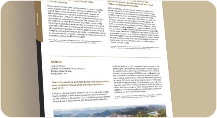 Rest of World Matilda (Wiluna) South Kalgoorlie Location: Australia Location: Australia ww Operator: Wiluna Mining Corporation Limited Operator: Northern Star Resources Limited vievie Precious Metals: Au Precious Metals: Au erer Royalty: NSR: 3.6% Royalty: NSR: 1-4% vv OO Franco-Nevada holds a 3.6% NSR royalty on all gold Northern Star Resources Limited (“Northern Star”) production from the Matilda/Wiluna Gold Project operates the South Kalgoorlie Operation (“SKO”) which located in Western Australia, covering all of the has been producing gold since 1989. 2 1,150 km property. SKO is located 15 km south of Kalgoorlie in Western Australia. Franco- Wiluna was discovered in 1896 and has produced in excess of 4.0 million Nevada holds a 1.75-4% NSR royalty for gold and a 1-2.25% NSR royalty ounces of gold to date, with nearly continuous production from 1987 for other minerals which covers 470 km2 of the SKO tenements including to 2013. Wiluna Mining Corporation Limited (“WMC”) acquired the the HBJ underground mine and the Mt Marion and Pernatty satellite Wiluna Gold Operation in 2014 and resumed mining operations in deposits, along with the 1.2 Mtpa Jubilee Mill. Effective January 1, 2023 etals 2016. Wiluna has a 2.1 Mtpa CIL treatment plant and processes ore from the royalty agreement was amended to increase the royalty rate on several open-pit and underground deposits. Total production for 2022 the northern and central sections of the HBJ underground mine from was 67,989 ounces of gold. In December 2021, WMC commissioned a 1.75% to 4%. Northern Star combines SKO with the Kalgoorlie, Carosue ecious M 750,000 tpa Sulphide Ore Concentrate Plant which was built at a cost of Dam and Kanowna Belle gold mines, and reported total production of r 847,372 ounces of gold at the combined Kalgoorlie Production Centre for P A$26 million. WMC went into Voluntary Administration on July 20, 2022. Mining operations ceased on December 14, 2022. Processing low-grade the year ended December 31, 2022. Northern Star placed the Jubilee mill stockpiles continued until February 2023. WMC plans to reprocess tailings on care and maintenance in July 2022, with ore feed directed to Kanowna for approximately 12-18 months. Franco-Nevada received $0.2 million of Belle and Kalgoorlie. Franco-Nevada estimates that the royalty production royalty revenue from Matilda/Wiluna in 2022. accounts for approximately 7% of total combined Kalgoorlie Production Centre production. Franco-Nevada received $2.4 million of royalty For Royalty Ounce calculation, Franco-Nevada estimates 100% of Mineral Resources and Mineral revenue from SKO in 2022. Reserves are subject to our royalty interest and estimates a rate of 3.6% is applicable For Royalty Ounce calculation, Franco-Nevada estimates 75% of Mineral Resources and 82% of Mineral Reserves are subject to our royalty interest and estimates a rate of 1.75% is applicable Kiziltepe Location: Türkiye Production guidance for 2023 is expected to be approximately 18,000 Operator: Zenit Madencilik San. ve Tic. A.S. ounces of gold. Open-pit mining during 2023 will continue largely at Precious Metals: Au & Ag the Arzu North, Derya and Banu pits. Ariana Resources has previously Royalty: NSR: 2.5% estimated average production of 20,000 ounces of gold equivalent per year over an 8-year mine life with potential to increase to at least 10 years including satellite deposits. Production at Kiziltepe is expected to Franco-Nevada has a 2.5% NSR on the Kiziltepe gold-silver be lower in 2023, due to lower-grade ore and a reduced ore throughput mine located in Türkiye which started production in rate to the mill of approximately 350,000 tonnes per annum. Extensive April 2017. near-mine exploration is underway, with positive results received across various vein systems covered by Franco-Nevada’s royalty. In 2023, recent Kiziltepe is operated by Zenit Madencilik San. ve Tic. A.S., a JV owned by geophysics will be fully assessed to determine the drilling required to Özaltin Holding A.S. (53%), Ariana Resources PLC (“Ariana Resources”) adequately test these newly identified targets. (23.5%) and Proccea Construction Co. (23.5%). Kiziltepe produced 28,421 For Royalty Ounce calculation, Franco-Nevada estimates 100% of the Mineral Resources and Mineral ounces of gold in 2022 compared with 20,737 ounces of gold in 2021. Reserves are subject to our royalty interest and estimates a rate of 2.5% is applicable. Kiziltepe, Türkiye 80 Franco-Nevada Corporation TSX / NYSE: FNV