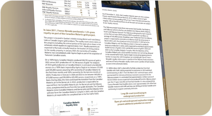 63 Franco-Nevada Corporation TSX / NYSE: FNV Canada Mineral Resources and Mineral Reserves Additional Information Diversified Assets Canadian Malartic Location: Quebec, Canada Operator: Agnico Eagle Mines Limited Precious Metals: Au Royalty: GR: 1.5% Mill Malartic (town site) Hwy 117 deviation Canadian Malartic Royalty Area 1.5% Royalty Claims Quartz Veins Mineralized Envelopes Open Pit East Gouldie Barnat Pit Canadian Malartic Pit East Malartic Jeffrey Pit Sheehan Odyssey Jupiter Odyssey South Odyssey North Rail line Rail line 1 0 km N Gouldie As of December 31, 2022, the Canadian Malartic open-pit mine contains Proven and Probable Mineral Reserves of 3.0 million ounces of gold (104.0 million tonnes grading 0.90 g/t Au). Franco-Nevada estimates that roughly 10% of the Mineral Reserves of the open-pit complex are subject to our royalty interest. The Odyssey project hosts three main zones: East Gouldie, East Malartic, and Odyssey (which is further sub-divided into Odyssey North, Odyssey South and Odyssey Internal). The Odyssey underground project supports a mine life to at least 2039 and post 2029 is expected to produce an average of 545,400 ounces of gold per year. Production from the Odyssey project is expected to commence at Odyssey South by ramp access in March 2023, with the mined ore to be processed at 51,500 tpd at the Canadian Malartic mill. The Odyssey project is forecast to gradually ramp-up production in 2023, and is expected to contribute approximately 50,000 ounces of gold in 2023 and 80,000 ounces of gold in 2024 and 2025 to the Canadian Malartic Complex. With the depletion of the Canadian Malartic pit in 2023 and the transition to in-pit tailings disposal in the second half of 2024, Agnico Eagle is evaluating opportunities to further increase the mill throughput up to 60,000 tpd. One of Franco- Nevada’s royalty claims covers a portion of the Odyssey South extension and two of Franco-Nevada’s royalty claims cover a portion of East Gouldie, as seen in the schematic below. A 1,800m deep shaft is planned to facilitate production from East Gouldie with shaft sinking expected to commence in 2023 and shaft commissioning in 2027. From the March 2021 technical report, which summarized the internal preliminary economic assessment for the Odyssey project, it is estimated that approximately 5 million ounces of the 6.9 million ounces expected to be produced from the Odyssey project over the 17-year mine life are from East Gouldie. It is also estimated that Franco-Nevada’s East Gouldie claims cover approximately 35% of the East Gouldie resource with infill and step-out drilling at the East Gouldie zone continuing to support continuity and scale. Long-life asset transitioning to underground production Open pit and underground exploration targets present additional potential ore sources 2022 2021 2020 Revenue to Franco-Nevada ($ million) $ 2.3 $ 2.4 $ 3.1 M&I Resource (koz Au) 1 8,314 5,214 4,638 Inferred Resource (koz Au) 1 2,772 6,236 6,602 P&P Reserves (koz Au) 1 3,010 3,534 4,428 M&I Royalty Ounces (000s) 1, 2 25 13 6 Inferred Royalty Ounces (000s) 2 28 32 34 P&P Royalty Ounces (000s) 2 5 5 6 1 Please refer to the tables on pages 116-120 for a breakout of grade and tonnages by Mineral Resource category; all M&I categories are inclusive of Mineral Reserves 2 For Royalty Ounce calculation, Franco-Nevada estimates 10% of the Mineral Reserves (9% in 2021, 9% in 2020), 20% of the M&I Mineral Resources (16% in 2021, 9% in 2020) and 68% of the Inferred Mineral Resources (34% in 2021, 34% in 2020) are subject to our royalty interest and estimates a rate of 1.5% is applicable In June 2011, Franco-Nevada purchased a 1.5% gross royalty on part of the Canadian Malartic gold project. The project is located in Quebec’s Abitibi mining district and rivals Detour Lake as Canada’s largest gold producer. The royalty covers seven claims on the property including the central portion of the open pit as shown in the schematic which equates to approximately 3 km 2 . Royalty payments are expected to fluctuate annually based on the location of mining relative to the royalty property. In January 2023, the ownership of Canadian Malartic was consolidated under Agnico Eagle as part of the acquisition of Yamana’s Canadian assets. On a 100% basis, Canadian Malartic produced 658,792 ounces of gold in 2022 versus 2021 production of 714,784 ounces of gold. The midpoint of 2023 gold production at Canadian Malartic is estimated to be 668,000 ounces on a 100% basis (reported by Agnico Eagle to be between 575,000 and 595,000 ounces assuming 50% ownership of Canadian Malartic for the first three months and 100% ownership for the last nine months of 2023). Production is forecast in 2024 and 2025 to be between 645,000 to 675,000 ounces and 595,000 to 625,000 ounces, respectively on a 100% basis. During 2022, the mine continued the transition from the Canadian Malartic pit to the Barnat pit. In 2023, production is expected to be sourced from the Canadian Malartic pit, the Barnat pit and the Odyssey mine, complemented by ore from the low-grade stockpiles. The Canadian Malartic mine (Canadian Malartic and Barnat pits) and the Odyssey mine will now form the Canadian Malartic Complex in 2023, with the Canadian Malartic pit expected to be completed late in the first half of 2023. Canadian Malartic Quebec Ontario Canadian Malartic, Quebec