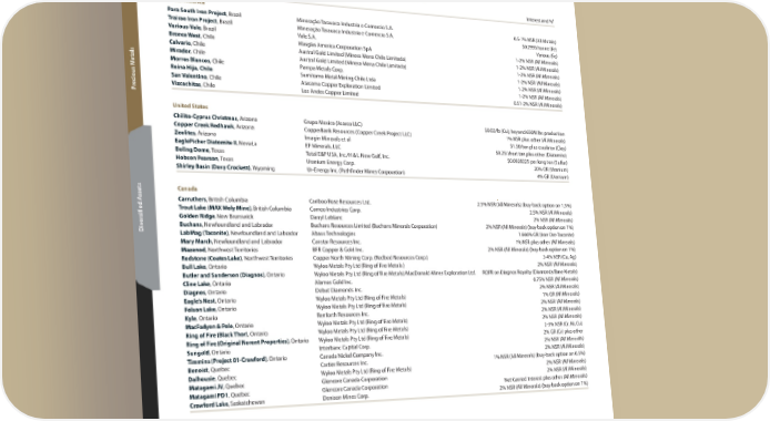 Diversified (Mining) Exploration Assets Diversified (Mining) Exploration Assets w vie er The following table is a list of the diversified (mining) exploration assets of Franco-Nevada as at April 12, 2023. A list of the precious metals exploration v O assets can be found on pages 83-85. Assets that have had their terms or leases expire and have been written off are not listed. Diversified – Iron Ore and Other Mining Exploration Assets as at April 12, 2023 Asset Operator Interest and %1 South America Para South Iron Project, Brazil Mineração Tarauaca Industria e Comercio S.A. 0.5-1% NSR (All Metals) Trairao Iron Project, Brazil Mineração Tarauaca Industria e Comercio S.A. $0.2995/tonne (Fe) Various-Vale, Brazil Vale S.A. Various (Fe) Bronce West, Chile Masglas America Corporation SpA 1-2% NSR (All Minerals) Calvario, Chile Austral Gold Limited (Minera Mena Chile Limitada) 1-2% NSR (All Minerals) Mirador, Chile Austral Gold Limited (Minera Mena Chile Limitada) 1-2% NSR (All Minerals) etals Morros Blancos, Chile Pampa Metals Corp. 1-2% NSR (All Minerals) Reina Hija, Chile Sumitomo Metal Mining Chile Ltda 1-2% NSR (All Minerals) San Valentino, Chile Atacama Copper Exploration Limited 1-2% NSR (All Minerals) ecious M Vizcachitas, Chile Los Andes Copper Limited 0.51-2% NSR (All Minerals) r P United States Chilito-Cyprus Christmas, Arizona Grupo Mexico (Asarco LLC) $0.02/lb (Cu); beyond 650M lbs production Copper Creek Redhawk, Arizona CopperBank Resources (Copper Creek Project LLC) 1% NSR plus other (All Minerals) Zeolites, Arizona Imagin Minerals et al $1.50/ton plus escalator (Clay) EaglePicher Diatomite II, Nevada EP Minerals, LLC $0.25/short ton plus other (Diatomite) Boling Dome, Texas Total E&P USA, Inc./H & L New Gulf, Inc. $0.0028225 per long ton (Sulfur) Hobson Pearson, Texas Uranium Energy Corp. 20% OR (Uranium) Shirley Basin (Davy Crockett), Wyoming Ur-Energy Inc. (Pathfinder Mines Corporation) 4% GR (Uranium) ssets Canada Carruthers, British Columbia Cariboo Rose Resources Ltd. 2.5% NSR (All Minerals) (buy-back option on 1.5%) Trout Lake (MAX Moly Mine), British Columbia Cameo Industries Corp. 2.5% NSR (All Minerals) ersified A Golden Ridge, New Brunswick Darryl Leblanc 2% NSR (All Minerals) iv Buchans, Newfoundland and Labrador Buchans Resources Limited (Buchans Minerals Corporation) 2% NSR (All Minerals) (buy-back option on 1%) D LabMag (Taconite), Newfoundland and Labrador Abaxx Technologies 1.666% GR (Iron Ore-Taconite) Mary March, Newfoundland and Labrador Canstar Resources Inc. 1% NSR plus other (All Minerals) Mazenod, Northwest Territories BFR Copper & Gold Inc. 2% NSR (All Minerals) (buy-back option on 1%) Redstone (Coates Lake), Northwest Territories Copper North Mining Corp. (Redbed Resources Corp.) 3-4% NSR (Cu, Ag) Bull Lake, Ontario Wyloo Metals Pty Ltd (Ring of Fire Metals ) 2% NSR (All Minerals) Butler and Sanderson (Diagnos), Ontario Wyloo Metals Pty Ltd (Ring of Fire Metals)/MacDonald Mines Exploration Ltd. ROFR on Diagnos Royalty (Diamonds/Base Metals) Cline Lake, Ontario Alamos Gold Inc. 0.75% NSR (All Minerals) Diagnos, Ontario Debut Diamonds Inc. 2% NSR (All Minerals) Eagle’s Nest, Ontario Wyloo Metals Pty Ltd (Ring of Fire Metals) 1% GR (All Minerals) Folson Lake, Ontario Wyloo Metals Pty Ltd (Ring of Fire Metals) 2% NSR (All Minerals) Kyle, Ontario Renforth Resources Inc. 2% NSR (All Minerals) MacFadyen & Pele, Ontario Wyloo Metals Pty Ltd (Ring of Fire Metals) 2% NSR (All Minerals) Ring of Fire (Black Thor), Ontario Wyloo Metals Pty Ltd (Ring of Fire Metals) 2-3% NSR (Cr, Ni, Cu) Ring of Fire (Original Noront Properties), Ontario Wyloo Metals Pty Ltd (Ring of Fire Metals) 2% GR (Cr) plus other Sungold, Ontario Interbanc Capital Corp. 2% NSR (All Minerals) Timmins (Project 81-Crawford), Ontario Canada Nickel Company Inc. 2% NSR (All Minerals) Benoist, Quebec Cartier Resources Inc. 1% NSR (All Minerals) (buy-back option on 0.5%) Dalhousie, Quebec Wyloo Metals Pty Ltd (Ring of Fire Metals) 2% NSR (All Minerals) Matagami JV, Quebec Glencore Canada Corporation 2% NSR (All Minerals) Matagami PD1, Quebec Glencore Canada Corporation Net Carried Interest plus other (All Minerals) Crawford Lake, Saskatchewan Denison Mines Corp. 2% NSR (All Minerals) (buy-back option on 1%) 102 Franco-Nevada Corporation TSX / NYSE: FNV