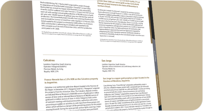 South America Posse (Mara Rosa) CentroGold (Gurupi) Location: Brazil, South America Location: Brazil, South America Operator: Hochschild Mining PLC Operator: Oz Minerals Limited Precious Metals: Au Precious Metals: Au Royalty: NSR: 1% Royalty: NSR: 0-1% Franco-Nevada holds a 1% NSR royalty on the Posse Franco-Nevada holds a sliding scale NSR royalty (1% at open-pit project located in Mara Rosa in the State of greater than $400 per ounce gold) on the CentroGold Goiás, Brazil. (Gurupi) project located in the State of Maranhão in Hochschild Mining PLC (“Hochschild”) acquired the project through northern Brazil. its acquisition of Amarillo Gold Corporation (“Amarillo”) in April 2022. Oz Minerals Limited (“Oz Minerals”) acquired the previous operator, Hochschild has revised the August 2020 feasibility study prepared by Avanco Resources Limited (“Avanco”), in 2018. In July 2019, Oz Minerals Amarillo and the updated mine plan forecasts a 10-year mine life from an released an updated prefeasibility study on the project which envisioned open-pit with average annual gold production of 80,000 ounces of gold a 10-year mine life with average annual gold production of 100,000 to per year with 100,000 ounces of gold per year over the first four years of 120,000 ounces of gold per year with 190,000 to 210,000 ounces of gold production. The brownfield project benefits from existing infrastructure per year in the first two years of production. There is currently a mining and received the License to Install from state regulators in February 2021. license injunction for the property. In 2022, Oz Minerals underwent an Initial capital for the project is estimated at $200 million. As of January extensive negotiation and agreement process on a Land Use Agreement 2023, construction is advancing on schedule and reported to be and, in December 2022, the National Institute of Colonization and 50% complete as of the end of December 2022, with first production Agrarian Reform approved the Land Use Agreement required for anticipated in H1 2024. progressing the court injunction removal. Oz Minerals intends to For Royalty Ounce calculation, Franco-Nevada estimates 100% of Mineral Resources and Mineral commence a feasibility study for the CentroGold project once the court Reserves are subject to our royalty interest and estimates an average rate of 1.0% is applicable injunction is removed. For Royalty Ounce calculation, Franco-Nevada estimates 100% of Mineral Resources and Mineral Reserves are subject to our royalty interest and estimates an average rate of 1.0% is applicable D iv ersified A Calcatreu San Jorge ssets Location: Argentina, South America Location: Argentina, South America Operator: Patagonia Gold PLC Operator: Aterra Investments Ltd. and Solway Industries Ltd. Precious Metals: Au & Ag Precious Metals: Au Royalty: NSR: 2.5% Royalty: NSR: 7.5% M Franco-Nevada has a 2.5% NSR on the Calcatreu property San Jorge is a copper-gold porphyry project located in the iner in Argentina. Province of Mendoza, Argentina. al R esour Calcatreu is an epithermal gold-silver deposit located in the Province of Coro Mining Corp. (“Coro Mining”) prepared a prefeasibility study in c Rio Negro. In December 2017, Patagonia Gold PLC (“Patagonia”) acquired 2012 for a flotation copper project with a proposed open pit mine with es and M the property from Pan American Silver. The Calcatreu deposit contains enriched and primary sulphide ore, although failed to receive permitting an Indicated Mineral Resource of 669,000 ounces of gold and 6.3 million to proceed with the project. Aterra Investments Ltd. and Solway iner ounces of silver and an Inferred Mineral Resource of 348,000 ounces of Industries Ltd. (“Solway”) acquired the property from Coro Mining in gold and 3.4 million ounces of silver. In 2022, Patagonia held a series April 2015 and the project is currently on care and maintenance. Solway al R of outreach meetings with local communities, authorities and unions has reported prefeasibility results with annual production of over 40,000 eser v presenting an update on activities, to seek input from those groups and tonnes of copper and 40,000 ounces of gold contained in concentrate es others which will form a vital part of the permitting process for the project over a 16-year life. Under revised terms of the royalty agreement Franco- moving forward. During the same period, surface rights covering a major Nevada received annual payments of $1.25 million per year for a 10-year portion of the current Mineral Resource at Calcatreu were purchased. period which ended in 2021. Franco-Nevada maintains a 7.5% NSR on all gold produced from the property, having acquired the royalty through its For Royalty Ounce calculation, Franco-Nevada estimates 100% of Mineral Resources and Mineral acquisition of Lumina Royalty Corp. in December 2011. Reserves are subject to our royalty interest and estimates an average rate of 2.5% is applicable For Royalty Ounce calculation, Franco-Nevada estimates 100% of Mineral Resources and Mineral A Reserves are subject to our royalty interest and estimates an average rate of 7.5% is applicable dditional I nf orma tion TSX / NYSE: FNV Franco-Nevada Corporation 35