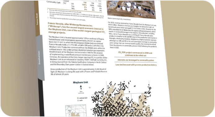 North America Weyburn Unit Location: Saskatchewan, Canada w Operator: Whitecap Resources Inc. vie Energy: Oil er Royalty: NRI: 11.71% /ORR: 0.44% / WI: 2.56% v O 2022 2021 2020 1 Revenue to Franco-Nevada ($ million) $ 65.0 $ 43.8 $ 16.0 2 Production (Mboe) 769 736 511 3 Commodity Split (%) Oil 100% 100% 100% Gas 0% 0% 0% NGL 0% 0% 0% 1 Revenue refers only to payments made to Franco-Nevada 2 Net to the Oil and Gas Interests based on 0.44% ORR, 11.71% NRI and 2.56% WI. ORR and W.I. volumes are a percentage of gross production. NRI volumes are pro-rated based on our profit, reflecting a net Weyburn processing facility, Saskatchewan etals interest 3 Percentage based on production revenue from each commodity For 2022, revenue received by Franco-Nevada from the Weyburn Unit was $65.0 million. Weyburn revenues are linked to the Edmonton Light oil ecious M Franco-Nevada, after Whitecap Resources Inc. benchmark price which averaged C$119.73/bbl in 2022. Revenue for the r P (“Whitecap”), has the second largest economic interest in NRI is recorded net of deductions for capital and operating costs, which the Weyburn Unit, one of the world’s largest geological CO results in increased leverage to the oil price. Oil production, including storage projects. 2 NGLs, net to Franco-Nevada was 2,374 Boe/d. Franco-Nevada takes product-in-kind for its WI and NRI share of this production and markets it The Weyburn Unit is located approximately 129 km southeast of Regina, through a third-party marketer. Weyburn is a highly economic reservoir, 2 although our NRI and WI in the unit have higher leverage to commodity Saskatchewan and encompasses approximately 216 km on a gross price swings than our revenue based royalties. Our interests benefited basis (net 31 km2) in which the Mississippian Midale beds are unitized. Franco-Nevada holds a 11.71% NRI, a 0.44% ORR and a 2.56% WI in the from the recovery in commodity prices in 2022 following the pandemic Weyburn Unit. Production commenced from the Midale zone within the lows in 2020. unitized area in 1955 under primary depletion (solution gas expansion). CO EOR project commenced in 2000 and Establishment of the Weyburn Unit occurred in 1963 for the purpose 2 continues to be rolled out ssets of implementing a waterflood pressure maintenance scheme. In 2000, Cenovus, the operator at that time, began injecting CO2 in a portion of the Interests are leveraged to commodity prices Weyburn Unit as an enhanced oil recovery (“EOR”) method. Currently, CO ersified A is being sourced from the Dakota Gasification Company in North Dakota 2 iv D and the Boundary Dam power station in Saskatchewan. Low decline asset with proven production history Gross production of the Weyburn Unit is approximately 21,000 Boe/d of light oil. Weyburn is a long-life asset with a Proven and Probable Reserve life of almost 20 years. Weyburn Unit N T7 Note: not to scale Unitized land wells R15W2 R14W2 R13W2 R12W2 R11W2 R10W2 R9W2 R8W2 T9 T9 T8 Weyburn, SK T8 T7 Weyburn T6T7 Unit Unitized land N T6 Note: T6 not to scale Midale, SK T5 T5 T4 T4 T3 T3 R15W2 R14W2 R13W2 R12W2 R11W2 R10W2 R9W2 R8W2 T5 R14W2 R13W2 R12W2 110 Franco-Nevada Corporation TSX / NYSE: FNV
