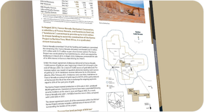 Rest of World Karma Location: Burkina Faso Operator: Néré Mining SA Precious Metals: Au Stream: 4.875% Gold Stream 2022 2021 2020 Revenue to Franco-Nevada ($ million) $ 3.3 $ 9.9 $ 28.9 M&I Resource (koz Au)1 1,898 1,898 2,042 Inferred Resource (koz Au)1 679 679 681 P&P Reserves (koz Au)1 158 158 293 1, 2 M&I Royalty Ounces (000s) 74 74 80 2 Inferred Royalty Ounces (000s) 26 26 27 2 P&P Royalty Ounces (000s) 6 6 11 1 Please refer to the tables on pages 116-120 for a breakout of grade and tonnages by Mineral Resource category; all M&I categories are inclusive of Mineral Reserves 2 100% of the Mineral Resources and Mineral Reserves at Karma are subject to a rate of 3.9% (6.5% Karma, Bukina Faso gold stream which is factored by 80% to equate to a Royalty Ounce as well as Franco-Nevada’s 75% interest) In August 2014, Franco-Nevada (Barbados) Corporation, Karma a subsidiary of Franco-Nevada, and Sandstorm Gold Ltd. Gold Stream (“Sandstorm”) committed to provide up to $120 million in stream funding to assist the construction of the Karma N 0 10 Project in Burkina Faso, West Africa, in a syndicated km stream transaction. Rounga Franco-Nevada committed 75% of the funding and Sandstorm committed the remaining 25%. Franco-Nevada ultimately contributed $78.75 million D Youba iv ($75 million with $3.75 million as part of an increase option). The Karma Tougou ersified A Project was constructed by True Gold Mining Inc. which was acquired by Endeavour in March 2016. In March 2022, Endeavour announced the sale of its 90% interest in Karma to Néré Mining SA (“Néré”). Bogoya ssets Nami Pit Under the stream agreement, Endeavour delivered to Franco-Nevada Bonguirga 15,000 ounces of gold per year, beginning in March 2016 through to the Namissiguima end of February 2021, for a total of 75,000 ounces of gold delivered. The Ouahigouya Ouest increase option was repaid in 8 quarterly deliveries totaling 5,625 ounces Kao Nord Kao Pit of gold by Q1 2019. Sandstorm receives deliveries for its 25% interest Kao Sud directly. After February 2021, Endeavour and, now Néré, shall deliver to Franco-Nevada an amount of gold equal to 4.875% of the gold produced M at Karma over the life of the mine in exchange for ongoing payments Karma iner Project Area equal to 20% of the spot price of gold. Area of al R Interest 5 km esour The Karma Project started production in 2016 and, in 2021, produced Current Exploitation c 88,000 gold ounces. Operations at Karma have been suspended following Area Nami Pit es and M security incidents at the mine in June and August 2022. As a result, Franco-Nevada only sold 1,759 GEOs from the mine in 2022, compared Goulagou I Pit with 5,556 GEOs in 2021. iner ALGERIA Goulagou II Pit 2 Rambo Pit al R The stream agreement covers all of the concessions within the 856 km MALI eser Karma Project and also includes a defined area of interest of 5 km Karma NIGER v surrounding the borders of the project. BURKINA FASO es BENIN TOGO North Kao COTE NIGERIA Prospective land package of 856 km2 D’IVOIRE GHANA Gold Zone Atlantic Ocean Kao Pit Trailing 4.875% gold stream in place A dditional I nf orma Burkina Faso tion TSX / NYSE: FNV Franco-Nevada Corporation 77