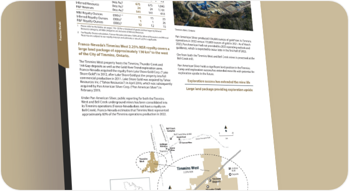 Canada Timmins West Location: Ontario, Canada ww Operator: Pan American Silver Corp. vievie Precious Metals: Au erer Royalty: NSR: 2.25% vv OO 2022 2021 2020 Revenue to Franco-Nevada ($ million) $ 3.2 $ 3.2 $ 3.2 M&I Resource (koz Au)1 675 675 1,040 Inferred Resource (koz Au)1 24 24 1,161 P&P Reserves (koz Au)1 541 541 653 1, 2 M&I Royalty Ounces (000s) 15 15 23 2 Inferred Royalty Ounces (000s) 1 1 26 2 P&P Royalty Ounces (000s) 12 12 15 Timmins West, Ontario etals 1 Please refer to the tables on pages 116-120 for a breakout of grade and tonnages by Mineral Resource category; all M&I categories are inclusive of Mineral Reserves Pan American Silver produced 134,600 ounces of gold from its Timmins 2 For Royalty Ounce calculation, Franco-Nevada estimates 100% of the Mineral Resources and Mineral operations in 2022 versus 133,800 ounces of gold in 2021. As of March Reserves are subject to our royalty interest and estimates a rate of 2.25% is applicable ecious M 2023, Pan American had not provided its 2023 operating outlook and r P guidance, which is expected to occur later in the first half of 2023. Franco-Nevada’s Timmins West 2.25% NSR royalty covers a 2 large land package of approximately 130 km to the west Ore from both the Timmins West and Bell Creek mines is processed at the of the City of Timmins, Ontario. Bell Creek mill. The Timmins West property hosts the Timmins, Thunder Creek and Pan American Silver holds a significant land position in the Timmins 144 Gap deposits as well as the Gold River Trend exploration zone. Camp and exploration success has extended mine life with potential for Franco-Nevada acquired the royalty from Lake Shore Gold Corp. (“Lake exploration upside in the future. Shore Gold”) in 2012, after Lake Shore Gold put the property into full commercial production in 2011. Lake Shore Gold was acquired by Tahoe Exploration success has extended the mine life Resources Inc. (“Tahoe Resources”) in April 2016, which was subsequently acquired by Pan American Silver Corp. (“Pan American Silver”) in Large land package providing exploration upside February 2019. Under Pan American Silver, public reporting for both the Timmins West and Bell Creek underground mines has been consolidated into its Timmins operations (Franco-Nevada does not have a royalty on Bell Creek). Franco-Nevada estimates that Timmins West represented approximately 60% of the Timmins operations production in 2022. Bur r o w Bell Creek s Benedic Complex Ma 0 N 20 ttagami R t F Bell Creek Mine & Mill ault Hoyle Pond ault cupine F or -P or Dest km iv Pamour Mine er F Hollinger ault McIntyre Dome Timmins Mine Timmins West Timmins West UG Mine 2.25% NSR Shaft Deposits Timmins Deposit N Thunder Creek Musselwhite 4 km 101 Deposit Quebec Ontario Gold River Trend 144 Gap Zone Deposit 62 Franco-Nevada Corporation TSX / NYSE: FNV