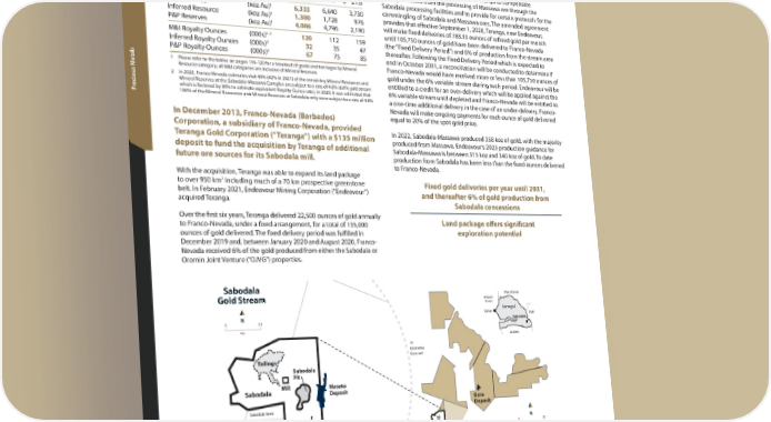 Rest of World Sabodala Location: Senegal In December 2019, Teranga announced an agreement to acquire the ww Operator: Endeavour Mining Corporation adjacent Massawa gold project and commenced processing ore from the vievie Precious Metals: Au project in 2020. Franco-Nevada’s stream does not extend to the Massawa erer Stream: Fixed gold deliveries / 6% Gold Stream gold project area. vv OO In September 2020, Franco-Nevada amended its existing Sabodala 2022 2021 2020 gold purchase and sale agreement with Teranga to compensate for displacement from the processing of Massawa ore through the Revenue to Franco-Nevada ($ million) $ 16.8 $ 16.7 $ 21.6 Sabodala processing facilities and to provide for certain protocols for the M&I Resource (koz Au)1 6,333 6,640 3,730 commingling of Sabodala and Massawa ores. The amended agreement Inferred Resource (koz Au)1 1,380 1,728 976 provides that effective September 1, 2020, Teranga, now Endeavour, P&P Reserves (koz Au)1 4,086 4,796 2,190 will make fixed deliveries of 783.33 ounces of refined gold per month until 105,750 ounces of gold have been delivered to Franco-Nevada 1, 2 M&I Royalty Ounces (000s) 120 112 159 (the “Fixed Delivery Period”) and 6% of production from the stream area 2 Inferred Royalty Ounces (000s) 32 35 47 thereafter. Following the Fixed Delivery Period which is expected to 2 P&P Royalty Ounces (000s) 67 75 85 end in October 2031, a reconciliation will be conducted to determine if etals 1 Please refer to the tables on pages 116-120 for a breakout of grade and tonnages by Mineral Franco-Nevada would have received more or less than 105,750 ounces of Resource category; all M&I categories are inclusive of Mineral Reserves gold under the 6% variable stream during such period. Endeavour will be 2 In 2022, Franco-Nevada estimates that 49% (42% in 2021) of the remaining Mineral Resources and entitled to a credit for an over-delivery which will be applied against the Mineral Reserves at the Sabodala-Massawa Complex are subject to a rate of 4.8% (6.0% gold stream 6% variable stream until depleted and Franco-Nevada will be entitled to ecious M which is factored by 80% to estimate equivalent Royalty Ounce rate). In 2020, it was estimated that r 100% of the Mineral Resources and Mineral Reserves at Sabodala only were subject to a rate of 4.8% P a one-time additional delivery in the case of an under-delivery. Franco- Nevada will make ongoing payments for each ounce of gold delivered In December 2013, Franco-Nevada (Barbados) equal to 20% of the spot gold price. Corporation, a subsidiary of Franco-Nevada, provided In 2022, Sabodala-Massawa produced 358 koz of gold, with the majority Teranga Gold Corporation (“Teranga”) with a $135 million produced from Massawa. Endeavour’s 2023 production guidance for deposit to fund the acquisition by Teranga of additional Sabodala-Massawa is between 315 koz and 340 koz of gold. To date future ore sources for its Sabodala mill. production from Sabodala has been less than the fixed ounces delivered to Franco-Nevada. With the acquisition, Teranga was able to expand its land package to over 950 km2 including much of a 70 km prospective greenstone Fixed gold deliveries per year until 2031, belt. In February 2021, Endeavour Mining Corporation (“Endeavour”) and thereafter 6% of gold production from acquired Teranga. Sabodala concessions Over the first six years, Teranga delivered 22,500 ounces of gold annually Land package offers significant to Franco-Nevada, under a fixed arrangement, for a total of 135,000 ounces of gold delivered. The fixed delivery period was fulfilled in exploration potential December 2019 and, between January 2020 and August 2020, Franco- Nevada received 6% of the gold produced from either the Sabodala or Oromin Joint Venture (“OJVG”) properties. Sabodala Mauritania Gold Stream Atlantic Ocean Senegal N Dakar Mali 0 2.5 Sabodala km Guinea 10 kilometres Tailings from mill Sabodala Pit Sabodala Mill Masato Deposit Gora Sabodala West Deposit N 0 20 Sabodala Concession km Niakafiri OJVG OJVG Concession Deposit Deposits Golouma Deposits 74 Franco-Nevada Corporation TSX / NYSE: FNV