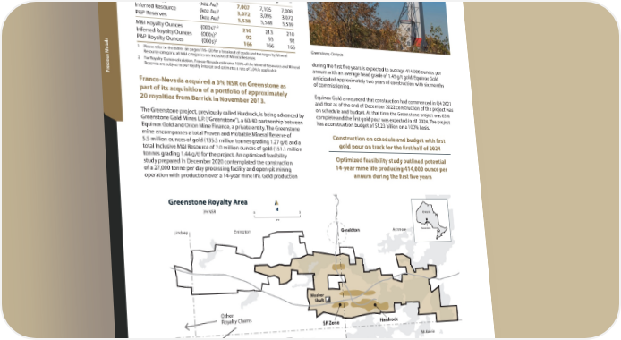 66 TSX / NYSE: FNV Franco-Nevada Corporation Canada Overview Overview Precious Metals Greenstone Location: Ontario, Canada Operator: Equinox Gold Corp. / Orion Mine Finance Precious Metals: Au Royalty: NSR: 3% Salsberg Ashmore Greenstone Royalty Area 3% NSR McKelvie Lindsey Parent N km 0 3 Errington Ontario Greenstone Royalty Area Mineralized zones Mosher Shaft SP Zone Hardrock Geraldton Other Royalty Claims during the first five years is expected to average 414,000 ounces per annum with an average head grade of 1.45 g/t gold. Equinox Gold anticipated approximately two years of construction with six months of commissioning. Equinox Gold announced that construction had commenced in Q4 2021 and that as of the end of December 2022 construction of the project was on schedule and budget. At that time the Greenstone project was 65% complete and the first gold pour was expected in H1 2024. The project has a construction budget of $1.23 billion on a 100% basis. Construction on schedule and budget with first gold pour on track for the first half of 2024 Optimized feasibility study outlined potential 14-year mine life producing 414,000 ounce per annum during the first five years 2022 2021 2020 Revenue to Franco-Nevada ($ million) $ – $ – $ – M&I Resource (koz Au) 1 7,007 7,105 7,008 Inferred Resource (koz Au) 1 3,072 3,095 3,072 P&P Reserves (koz Au) 1 5,538 5,538 5,539 M&I Royalty Ounces (000s) 1, 2 210 213 210 Inferred Royalty Ounces (000s) 2 92 93 92 P&P Royalty Ounces (000s) 2 166 166 166 1 Please refer to the tables on pages 116-120 for a breakout of grade and tonnages by Mineral Resource category; all M&I categories are inclusive of Mineral Reserves 2 For Royalty Ounce calculation, Franco-Nevada estimates 100% of the Mineral Resources and Mineral Reserves are subject to our royalty interest and estimates a rate of 3.0% is applicable Franco-Nevada acquired a 3% NSR on Greenstone as part of its acquisition of a portfolio of approximately 20 royalties from Barrick in November 2013. The Greenstone project, previously called Hardrock, is being advanced by Greenstone Gold Mines L.P. (“Greenstone”), a 60/40 partnership between Equinox Gold and Orion Mine Finance, a private entity. The Greenstone mine encompasses a total Proven and Probable Mineral Reserve of 5.5 million ounces of gold (135.3 million tonnes grading 1.27 g/t) and a total Inclusive M&I Resource of 7.0 million ounces of gold (151.1 million tonnes grading 1.44 g/t) for the project. An optimized feasibility study prepared in December 2020 contemplated the construction of a 27,000 tonne per day processing facility and open-pit mining operation with production over a 14-year mine life. Gold production Greenstone, Ontario