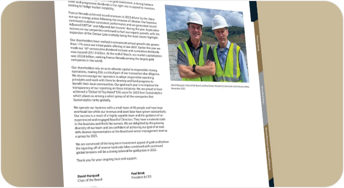 Overview Dear Stakeholders O v er Our diversified portfolio of cash-flow producing assets provides our shareholders exposure to vie production growth and exploration optionality from high quality mineral and energy deposits in w many of the world’s most prospective resource trends. We believe combining a lower-risk gold investment, a strong balance sheet and progressive dividends is the right mix to appeal to investors seeking to hedge market instability. Franco-Nevada achieved record revenues in 2022 driven by the sharp run-up in energy prices following the invasion of Ukraine. Our business continued to deliver consistent performance and we generated record P 1 1 r Adjusted EBITDA and Adjusted Net Income during the year. Exploration ecious M success on our properties continued to fuel our organic growth, with the expansion of the Detour Lake orebody being the most recent highlight. etals Our shareholders have realized a compound annual growth rate greater than 17% since our initial public offering in late 2007. Earlier this year we th made our 16 consecutive dividend increase and cumulative dividends now exceed US$1.9 billion. At the end of March, our market capitalization was US$28 billion, ranking Franco-Nevada among the largest gold companies in the world. Our shareholders rely on us to allocate capital to responsible mining operations, making ESG a critical part of our transaction due diligence. We also encourage our operators to adopt responsible operating principles and work with them to develop and fund programs to D benefit their local communities. Our goal each year is to improve the David Harquail, Chair of the Board and Paul Brink, President & CEO at the Cobre Panama Mine, iv transparency of our reporting on these initiatives. We are proud to have November 2022 ersified A achieved a “Global 50 Top Rated” ESG score for 2023 from Sustainalytics which places us among a select group of all the companies that Sustainalytics ranks globally. ssets We operate our business with a small team of 40 people and have kept overhead low while our revenue and asset base have grown substantially. Our success is a result of a highly capable team and the guidance of an experienced and engaged Board of Directors. They have a material stake in the business and think like owners. We are delighted by the growing diversity of our team and are confident of achieving our goal of at least M 40% diverse representation at the Board and senior management level as iner a group by 2025. al R We are convinced of the long-term investment appeal of gold and believe esour the tapering off of reserve bank rate hikes combined with continued c global tensions will be a strong tailwind for gold prices in 2023. es and M Thank you for your ongoing trust and support. iner al R eser David Harquail v Paul Brink Chair of the Board President & CEO es April 12, 2023 A dditional I nf orma 1 Adjusted EBITDA and Adjusted Net Income are non-GAAP financial measures with no standardized meaning under International Financial Reporting Standards (“IFRS”) and might not be comparable to similar tion financial measures disclosed by other issuers. Refer to the “Non-GAAP Financial Measures” section starting on page 128 of this Asset Handbook TTSX / NSX / NYYSE: FNVSE: FNV FFrrancancoo-Nev-Nevada Cada Cororporporaationtion 11