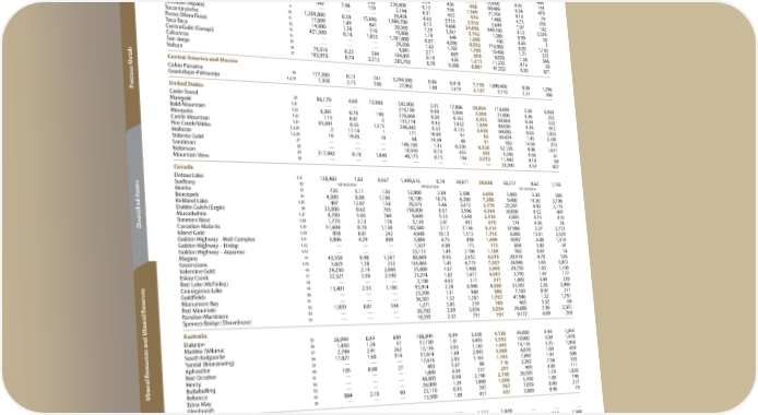 Mineral Resources and Mineral Reserves Gold Mineral Resources (Inclusive of Mineral Reserves) w vie Measured (M) Indicated (I) (M)+(I) Inferred er Tonnes Grade Contained Tonnes Grade Contained Contained Tonnes Grade Contained v Notes 000s g/t 000 oz 000s g/t 000 oz 000 oz 000s g/t 000 oz O South America Candelaria 3,4 826,839 0.13 3,373 405,558 0.15 1,963 5,336 149,583 0.10 484 Antapaccay 5 306,000 0.08 787 937,000 0.08 2,292 3,079 120,000 0.05 193 Condestable 6 32,975 0.24 255 55,438 0.24 426 688 60,489 0.24 479 Sossego 1,7 164,100 0.12 638 236,800 0.12 950 1,589 21,700 0.10 70 Cerro Moro 1,8 542 7.98 139 2,144 6.31 435 574 1,488 4.73 226 Salares Norte 9 — — — 26,424 4.63 3,933 3,933 2,649 1.67 142 Cascabel (Alpala) 10 1,209,800 0.39 15,090 1,980,700 0.15 9,660 24,850 649,100 0.12 2,520 Tocantinzinho 11 17,609 1.49 841 30,505 1.29 1,261 2,102 1,580 0.99 50 Posse (Mara Rosa) 12 14,000 1.20 510 19,000 1.10 640 1,200 100 0.60 2 Taca Taca 13 421,500 0.14 1,853 1,781,800 0.07 4,200 6,052 716,900 0.05 1,183 CentroGold (Gurupi) 14 — — — 29,200 1.82 1,705 1,705 10,400 1.71 572 Calcatreu 15 — — — 9,841 2.11 669 669 8,078 1.34 348 San Jorge 16 79,518 0.22 584 104,091 0.19 626 1,211 11,235 0.16 59 Volcan 17 105,918 0.74 2,513 283,763 0.70 6,368 8,881 41,553 0.50 671 etals Central America and Mexico Cobre Panama 18 177,300 0.13 741 3,294,300 0.06 6,418 7,159 1,090,400 0.04 1,296 Guadalupe-Palmarejo 1,2,19 7,358 2.15 508 27,962 1.80 1,619 2,127 5,110 2.31 380 ecious M United States r P Carlin Trend 20 86,179 4.69 13,008 243,902 2.35 17,886 30,894 118,699 2.34 8,943 Marigold 1,21 — — — 319,100 0.49 5,004 5,004 21,800 0.36 252 Bald Mountain 1,22 8,381 0.70 190 276,664 0.50 4,163 4,353 50,064 0.30 522 Mesquite 1,23 115 0.81 3 135,174 0.43 1,852 1,855 84,030 0.34 912 Castle Mountain 1,24 85,691 0.55 1,515 246,442 0.52 4,123 5,638 69,890 0.63 1,422 Fire Creek/Midas 1,2,25 2 17.14 1 171 16.60 91 92 69,474 1.43 3,185 Hollister 1,2,26 16 19.05 10 64 19.59 40 51 582 14.58 273 Stibnite Gold 27 — — — 148,160 1.33 6,320 6,320 52,128 0.96 1,611 Sandman 28 — — — 18,550 0.73 433 433 3,246 0.58 61 Robinson 29 317,942 0.18 1,840 40,173 0.15 194 2,072 11,942 0.18 69 Mountain View 30 — — — — — — — 23,200 0.57 427 Canada Detour Lake 1,31 138,483 1.03 4,567 1,440,616 0.74 34,071 38,638 58,317 0.62 1,156 Sudbury 32 not available not available not available ssets Hemlo 33 720 5.11 120 52,000 2.09 3,500 3,600 5,400 3.30 580 Brucejack 34 4,300 8.00 1,100 18,100 10.70 6,200 7,200 9,400 10.30 3,100 Kirkland Lake 1,35 407 12.07 158 20,575 5.46 3,612 3,770 22,291 4.43 3,175 Dublin Gulch (Eagle) 36 35,000 0.62 705 198,000 0.57 3,596 4,304 30,000 0.52 497 ersified A Musselwhite 1,37 4,700 5.03 760 9,600 5.35 1,650 2,410 3,000 4.15 410 iv Timmins West 1,38 1,770 3.13 178 5,139 3.01 497 675 174 4.36 24 D Canadian Malartic 1,39 51,604 0.70 1,158 102,580 2.17 7,156 8,314 37,986 2.27 2,772 Island Gold 1,40 854 8.81 242 4,648 10.12 1,513 1,755 8,066 13.61 3,529 Golden Highway – Holt Complex 1,41 5,806 4.29 800 5,884 4.75 898 1,699 9,097 4.48 1,310 Golden Highway – Hislop 1,42 — — — 1,337 4.00 173 173 804 3.80 97 Golden Highway – Aquarius 1,43 — — — 23,112 1.49 1,106 1,106 502 0.87 14 Magino 44 43,558 0.98 1,367 88,849 0.93 2,652 4,019 20,919 0.78 526 Greenstone 1,45 5,623 1.28 232 145,463 1.45 6,775 7,007 24,948 3.83 3,072 Valentine Gold 46 29,230 2.19 2,060 35,400 1.67 1,900 3,960 20,750 1.65 1,100 Eskay Creek 47 22,521 3.58 2,590 25,274 1.82 1,477 4,067 3,750 1.47 177 Red Lake (McFinley) 48 — — — 2,100 4.63 317 317 1,800 3.84 220 eseses Courageous Lake 49 13,401 2.53 1,100 93,914 2.28 6,900 8,000 53,587 2.26 3,900 vvv Goldfields 50 — — — 23,200 1.31 980 980 7,100 0.92 211 eseresereser Monument Bay 51 — — — 36,581 1.52 1,787 1,787 41,946 1.32 1,781 al Ral Ral R Red Mountain 52 1,920 8.81 544 1,271 5.85 239 783 405 5.32 69 Fenelon-Martiniere 53 — — — 30,702 3.09 3,054 3,054 24,680 2.96 2,351 inerineriner Spences Bridge (Shovelnose) 54 — — — 10,592 2.32 791 791 9,177 0.89 263 Australia Duketon 55 26,000 0.83 690 108,000 0.99 3,430 4,120 34,000 0.94 1,030 es and Mes and Mes and MMatilda (Wiluna) 56 1,430 1.24 57 57,100 1.91 3,495 3,552 19,900 3.09 1,978 ccc South Kalgoorlie 57 2,799 2.91 262 12,136 3.03 1,183 1,445 10,116 3.25 1,058 esouresouresourYandal (Bronzewing) 58 17,821 1.60 914 57,614 1.60 2,995 3,909 8,878 1.60 459 Aphrodite 59 — — — 17,614 2.05 1,163 1,163 7,892 1.97 500 al Ral Ral R Red October 60 105 8.00 27 483 5.67 88 116 2,287 7.54 555 Henty 61 — — — 1,800 4.50 257 257 900 4.00 111 inerineriner Bullabulling 62 — — — 68,805 0.99 2,190 2,190 26,595 1.19 1,020 MMM Rebecca 63 — — — 26,000 1.20 1,000 1,000 5,700 1.00 190 Edna May 64 884 2.10 60 23,110 0.95 707 767 7,039 0.96 217 Glenburgh 65 — — — 13,500 1.00 431 431 2,800 0.90 79 Rest of World MWS 66 75,200 0.22 533 165,400 0.25 1,317 1,849 — — — Sabodala-Massawa Complex 67 22,300 1.18 843 83,800 2.04 5,490 6,333 19,900 2.16 1,380 Tasiast 1,68 63,303 1.16 2,359 89,945 1.69 4,880 7,239 18,565 2.40 1,443 Subika (Ahafo) 1,69 40,600 1.88 2,454 96,600 2.16 6,710 9,160 21,200 2.41 1,640 Karma 70 300 0.40 4 47,700 1.24 1,894 1,898 16,200 1.30 679 Edikan 71 18,200 1.06 620 37,900 1.04 1,265 1,885 5,300 1.66 283 Kiziltepe 72 600 3.01 58 698 2.33 52 110 1,180 2.09 79 Séguéla 1,73 — — — 19,171 2.61 1,611 1,611 9,154 3.26 960 Perama Hill 74 3,093 4.15 412 10,973 2.73 962 1,374 16,006 1.53 787 Aği Daği 1,75 2,516 0.74 60 104,453 0.63 2,132 2,192 19,551 0.52 330 Sissingué 76 1,300 1.34 56 1,200 1.39 55 111 100 1.10 2 Total Gold Mineral Resources* 71,488 217,421 288,987 71,464 * Total excludes New Prosperity 116116 FFrrancancoo-Nev-Nevada Cada Cororporporaationtion TTSX / NSX / NYYSE: FNVSE: FNV