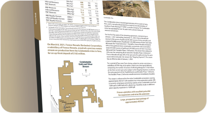 30 TSX / NYSE: FNV Franco-Nevada Corporation South America Overview Overview Precious Metals Condestable Location: Peru, South America Operator: Southern Peaks Mining LP Precious Metals: Au & Ag Stream: Gold and Silver Stream Santia Antofagasta Arequipa Cusco Mina Justa Cerro Pelado Sant Teresa de Colm’o Punt Mantoverde El Espino Panulcillo IOCG Deposit Lima N 0 250 km Condestable Candelaria Cretaceous IOCG Belt IOCG Mine (FNV Stream) Pacific Ocean Chil Peru Condestable UG Surface Facilities Raul UG Vinchos UG Pacific Ocean N 0 5 km Condestable Gold and Silver Stream Condestable Mining Property 102 km to Lima Pan American Hwy Antofagasta Arequipa Cusco Mina Justa Cerro Pelado Santo Domingo Teresa de Colm’o Punta del Cobre Mantoverde IOCG Deposit Lima La Paz Salta N 0 250 km Condestable Candelaria Cretaceous IOCG Belt IOCG Mine (FNV Stream) Pacific Ocean Bolivia Argentina Chile Peru Condestable UG Surface Facilities Raul UG Vinchos UG Pacific Ocean N 0 5 km Condestable Gold and Silver Stream 102 km to Lima Pan American The Condestable mine is located approximately 90 km south of Lima, Peru, and is owned and operated by a majority-owned subsidiary of Southern Peaks Mining LP (“SPM”), a private company. The Condestable mine has operated for over 50 years with a proven history of resource conversion. For the first five years of the streaming agreement, commencing on January 1, 2021 and ending December 31, 2025, Franco-Nevada will receive 8,760 ounces of gold and 291,000 ounces of silver annually until a total of 43,800 ounces of gold and 1,455,000 ounces of silver have been delivered (the “Fixed Deliveries”). Thereafter, Franco-Nevada will receive 63% of the gold and silver contained in concentrate until a cumulative total of 87,600 ounces of gold and 2,910,000 ounces of silver have been delivered (the “Variable Phase 1 Deliveries”). The stream then reduces to 25% over the remaining life of mine (the “Variable Phase 2 Deliveries”). Franco-Nevada will pay 20% of the spot price for gold and silver for each ounce delivered under the stream (the “Ongoing Payment”). The stream has an effective date of January 1, 2021. For a period of four years from closing, subject to certain restrictions, a subsidiary of SPM may, at its option, make a one-time special delivery comprising the number of ounces of refined gold equal to $118.8 million at the then current spot price subject to the Ongoing Payment, to achieve the early payment of the Fixed Deliveries and Variable Phase 1 Deliveries. The Variable Phase 2 Deliveries would commence immediately thereafter. The stream is referenced to the entire Condestable concessions covering approximately 450 km 2 with excellent near mine exploration upside. SPM is currently ramping up processing capacity at the Condestable mine from 7,000 tpd to 8,400 tpd and is advancing a feasibility study on additional plant capacity expansion to 10,000 tpd. Proven operation with excellent potential for expansions and mine life extension Large, prospective land package of approximately 450 km 2 2022 2021 2020 Revenue to Franco-Nevada ($ million) $ 22.4 $ 22.5 $ – M&I Resource (koz Au) 1 688 701 711 Inferred Resource (koz Au) 1 479 480 481 P&P Reserves (koz Au) 1 163 170 n/a M&I Resource (Moz Ag) 1 17.4 17.6 17.9 Inferred Resource (Moz Ag) 1 12.2 12.3 12.3 P&P Reserves (Moz Ag) 1 5.2 5.2 n/a M&I Royalty Ounces (000s) 1, 2 164 180 188 Inferred Royalty Ounces (000s) 2 87 89 92 P&P Royalty Ounces (000s) 2 97 n/a n/a 1 Please refer to the tables on pages 116-120 for a breakout of grade and tonnages by Mineral Resource category; all M&I categories are inclusive of Mineral Reserves 2 For Royalty Ounce calculation, Franco-Nevada estimates fixed deliveries for M&I Royalty Ounces of 8,760 ounces of gold and 291,000 ounces of silver per year until December 2025; then, 63% of gold and silver until 87,600 ounces of gold and 2,910,000 ounces of silver are delivered, respectively; thereafter, 25% of gold and silver ounces are subject to the stream. For Inferred Royalty Ounces, Franco-Nevada assumes 25% of gold and silver from Inferred Mineral Resources (25% in 2021) are subject to the stream. Silver has been converted to Royalty Ounces assuming $1,800/oz gold and $21.00/oz ($1,800/oz gold and $23.00/oz silver in 2021, $1,750/oz gold and $25.00/oz in 2020). The stream interest has been factored by ongoing payments of 20% of the spot price of gold and silver On March 8, 2021, Franco-Nevada (Barbados) Corporation, a subsidiary of Franco-Nevada, acquired a precious metals stream on production from the Condestable mine in Peru, for an up-front deposit of $165 million. Condestable, Peru