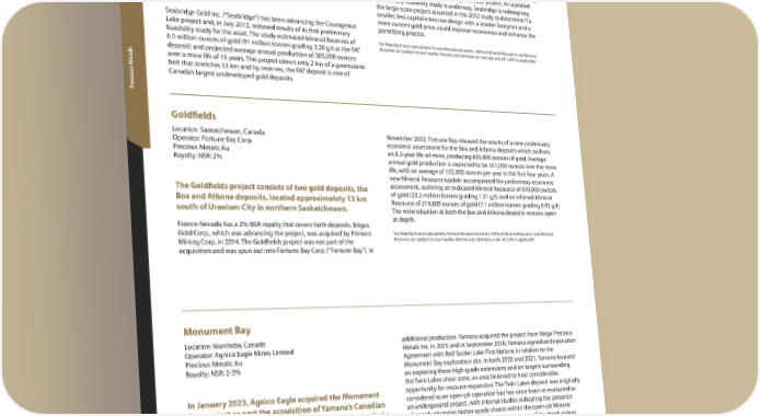 Canada Courageous Lake Location: Northwest Territories, Canada The property also hosts the Walsh Lake deposit (Inferred Mineral Resource ww Operator: Seabridge Gold Inc. of 4.6 million tonnes grading 3.24 g/t), which is located 10 km south vievie Precious Metals: Au of the larger FAT deposit. Metallurgical testing demonstrated that the erer Royalty: NSR: 1.02% Walsh Lake material is free milling. Based on these factors, the Walsh vv OO Lake deposit could be mined prior to constructing the processing plant required for the larger, refractory FAT deposit thereby improving The Courageous Lake project is an advanced gold the overall economics of the Courageous Lake project. An updated exploration project located in the Northwest preliminary feasibility study is underway. Seabridge is redesigning Territories, Canada. the large-scale project assumed in the 2012 study to determine if a smaller, less capital-intensive design with a smaller footprint and a Seabridge Gold Inc. (“Seabridge”) has been advancing the Courageous more current gold price, could improve economics and enhance the Lake project and, in July 2012, released results of its first preliminary permitting process. feasibility study for the asset. The study estimated Mineral Reserves of For Royalty Ounce calculation, Franco-Nevada estimates 100% of Mineral Resources and Mineral 6.5 million ounces of gold (91 million tonnes grading 2.20 g/t at the FAT Reserves are subject to our royalty interest and estimates an average rate of 1.02% is applicable deposit) and projected average annual production of 385,000 ounces etals over a mine life of 15 years. This project covers only 2 km of a greenstone belt that stretches 53 km and by reserves, the FAT deposit is one of Canada’s largest undeveloped gold deposits. ecious M r P Goldfields Location: Saskatchewan, Canada November 2022, Fortune Bay released the results of a new preliminary Operator: Fortune Bay Corp. economic assessment for the Box and Athona deposits which outlines Precious Metals: Au an 8.3-year life-of-mine, producing 835,000 ounces of gold. Average Royalty: NSR: 2% annual gold production is expected to be 101,000 ounces over the mine life, with an average of 122,000 ounces per year in the first four years. A new Mineral Resource update accompanied the preliminary economic The Goldfields project consists of two gold deposits, the assessment, outlining an Indicated Mineral Resource of 979,900 ounces Box and Athona deposits, located approximately 13 km of gold (23.2 million tonnes grading 1.31 g/t) and an Inferred Mineral south of Uranium City in northern Saskatchewan. Resource of 210,800 ounces of gold (7.1 million tonnes grading 0.92 g/t). The mineralization at both the Box and Athona deposits remains open Franco-Nevada has a 2% NSR royalty that covers both deposits. Brigus at depth. Gold Corp., which was advancing the project, was acquired by Primero For Royalty Ounce calculation, Franco-Nevada estimates 100% of Mineral Resources and Mineral Mining Corp. in 2014. The Goldfields project was not part of the Reserves are subject to our royalty interest and estimates a rate of 2.0% is applicable acquisition and was spun out into Fortune Bay Corp. (“Fortune Bay”). In Monument Bay Location: Manitoba, Canada additional production. Yamana acquired the project from Mega Precious Operator: Agnico Eagle Mines Limited Metals Inc. in 2015 and in September 2018, Yamana signed an Exploration Precious Metals: Au Agreement with Red Sucker Lake First Nations in relation to the Royalty: NSR: 2-3% Monument Bay exploration site. In both 2020 and 2021, Yamana focused on exploring these high-grade extensions and on targets surrounding the Twin Lakes shear zone, an area believed to host considerable In January 2023, Agnico Eagle acquired the Monument opportunity for resource expansion. The Twin Lakes deposit was originally Bay project as part the acquisition of Yamana’s Canadian considered as an open-pit operation but has since been re-evaluated as assets. The Monument Bay project, is located in Manitoba, an underground project, with internal studies indicating the presence of steeply plunging higher-grade shoots within the open-pit Mineral approximately 570 km northeast of Winnipeg adjacent to Resource. Deep drilling also provided an initial test of the depth extent the Ontario border. and potential of several high-grade shoots which are along the 4 km strike length of the deposit. Monument Bay consists of 136 contiguous claims and hosts a Measured For Royalty Ounce calculation, Franco-Nevada estimates 100% of Mineral Resources and Mineral and Indicated Mineral Resource base of 1.79 million ounces of gold in Reserves are subject to our royalty interest and estimates an average rate of 2.0% is applicable for the 36.6 million tonnes grading 1.52 g/t. Franco-Nevada holds a 2% NSR first 1.0 million ounces produced and 3.0% on any additional ounces royalty on the first 1.0 million ounces produced and a 3% NSR on any 70 Franco-Nevada Corporation TSX / NYSE: FNV