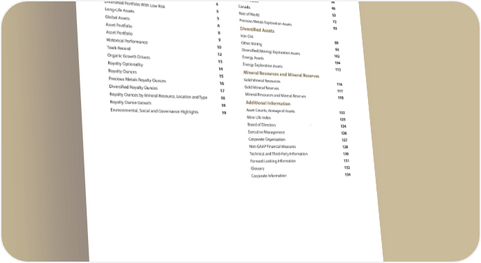 Contents Overview Precious Metals Assets Message to Stakeholders 1 South America 26 Our History 2 Central America and Mexico 36 Our Business Model 3 United States 40 Funding Successful Mines 4 Canada 53 Diversified Portfolio With Low Risk 5 Rest of World 72 Long-Life Assets 5 Precious Metals Exploration Assets 83 Global Assets 6 Diversified Assets Asset Portfolio 8 Iron Ore 89 Asset Portfolio 9 Other Mining 93 Historical Performance 10 Diversified (Mining) Exploration Assets 102 Track Record 12 Energy Assets 104 Organic Growth Drivers 13 Energy Exploration Assets 113 Royalty Optionality 14 Mineral Resources and Mineral Reserves Royalty Ounces 15 Gold Mineral Resources 116 Precious Metals Royalty Ounces 16 Gold Mineral Reserves 117 Diversified Royalty Ounces 17 Mineral Resources and Mineral Reserves 118 Royalty Ounces by Mineral Resource, Location and Type 18 Additional Information Royalty Ounce Growth 18 Asset Counts, Acreage of Assets 122 Environmental, Social and Governance Highlights 19 Mine Life Index 123 Board of Directors 124 Executive Management 126 Corporate Organization 127 Non-GAAP Financial Measures 128 Technical and Third-Party Information 130 Forward Looking Information 131 Glossary 132 Corporate Information 134 This Asset Handbook has not been prepared in connection with the sale of securities and is not an offering memorandum and should not be relied upon as such. This Asset Handbook does not constitute an offer to sell or a solicitation for an offer to purchase any security in any jurisdiction. Information relating to projects, properties and their owners and operators presented in this Asset Handbook has been sourced from the public disclosure of the owners and operators of our assets available as at March 9, 2023 (except where stated otherwise). More current information may become available in our subsequent disclosure and on our website. This Asset Handbook contains information about many of our assets, including those that may not currently be material to us. Also, the description and depiction of our business and assets have been simplified for presentation purposes. Dollar references are in U.S. dollars unless otherwise noted. This Asset Handbook should be read with reference to the explanatory notes and cautionary statements contained in the Additional Information section found at the end of this Asset Handbook. Please also refer to the additional supporting information and explanatory notes found in our Annual Information Form (“AIF”), our annual Management’s Discussion & Analysis (“MD&A“), and our Annual Report on Form 40-F available at www.sedar.com and www.sec.gov, respectively, and on our website at www.franco-nevada.com. This Asset Handbook complements but does not form part of such documents.