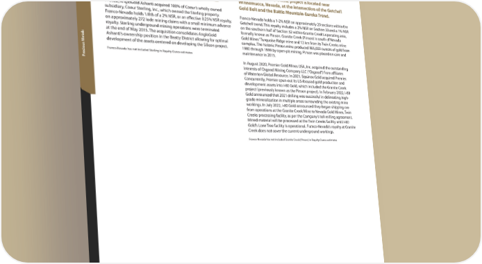 United States Sterling Granite Creek (Pinson) Location: Nevada, United States Location: Pinson, United States ww Operator: AngloGold Ashanti Operator: i-80 Gold Corp. vievie Precious Metals: Au Precious Metals: Au erer Royalty: NSR: 0.25% Royalty: NSR: 1-2% vv OO Sterling is a historic gold operation located 185 km The Granite Creek (Pinson) project is located near northwest of Las Vegas, Nevada near Beatty, Nevada. Winnemucca, Nevada, at the intersection of the Getchell In 2022, AngloGold Ashanti acquired 100% of Coeur’s wholly owned Gold Belt and the Battle Mountain-Eureka Trend. subsidiary, Coeur Sterling, Inc., which owned the Sterling property. Franco-Nevada holds a 1-2% NSR on approximately 20 sections within the Franco-Nevada holds 1/8th of a 2% NSR, or an effective 0.25% NSR royalty, Getchell trend. This royalty includes a 2% NSR on Section 33 and a 1% NSR on approximately 272 lode mining claims with a small minimum advance on the southern half of Section 32 within Granite Creek’s operating area, royalty. Sterling underground mining operations were terminated formally known as Pinson. Granite Creek (Pinson) is south of Nevada at the end of May 2015. The acquisition consolidates AngloGold Gold Mines’ Turquoise Ridge mine and 13 km from its Twin Creeks mine Ashanti’s ownership position in the Beatty District allowing for optimal complex. The historic Pinson mine produced 985,000 ounces of gold from etals development of the assets centered on developing the Silicon project. 1980 through 1999 by open-pit mining. Pinson was placed on care and Franco-Nevada has not included Sterling in Royalty Ounce estimates maintenance in 2015. ecious M r In August 2020, Premier Gold Mines USA, Inc. acquired the outstanding P interests of Osgood Mining Company LLC (“Osgood”) from affiliates of Waterton Global Resource. In 2021, Equinox Gold acquired Premier. Concurrently, Premier spun-out its US-focused gold production and development assets into i-80 Gold, which included the Granite Creek project (previously known as the Pinson project). In February 2022, i-80 Gold announced that 2021 drilling was successful in delineating high- grade mineralization in multiple areas surrounding the existing mine workings. In July 2022, i-80 Gold announced they began shipping ore from operations at the Granite Creek Mine to Nevada Gold Mines, Twin Creeks processing facility, as per the Company’s toll-milling agreement. Mined material will be processed at the Twin Creeks facility until i-80 Gold’s Lone Tree facility is operational. Franco-Nevada’s royalty at Granite Creek does not cover the current underground workings. Franco-Nevada has not included Granite Creek (Pinson) in Royalty Ounce estimates 52 Franco-Nevada Corporation TSX / NYSE: FNV