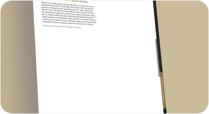 Other Mining Flying Fox Location: Australia Operator: IGO Limited Metals: Ni Royalty: GR: 2% Franco-Nevada has a 2% gross royalty on the southern portion of the Flying Fox nickel mine located in the Forrestania Greenstone belt in Western Australia. Flying Fox is a high-grade underground nickel mine which has been in production since 2007. In June 2022, IGO Limited (“IGO”) became the operator of Flying Fox after completing the A$1.1 billion takeover of Western Areas Ltd. IGO’s Forrestania Nickel Project includes the Flying Fox and Spotted Quoll mines and the Cosmic Boy Concentrator. During the six months ended December 2022, IGO reported 6,139 tonnes of nickel production at Forrestania. Approximately 11% of total Forrestania production was subject to Franco-Nevada’s royalty, and Franco-Nevada received $0.5 million of royalty revenue from Flying Fox for the year. Franco-Nevada has not included Flying Fox in Royalty Ounce estimates M iner al R esour c es and M iner al R eser v es A dditional I nf orma tion TSX / NYSE: FNV Franco-Nevada Corporation 101