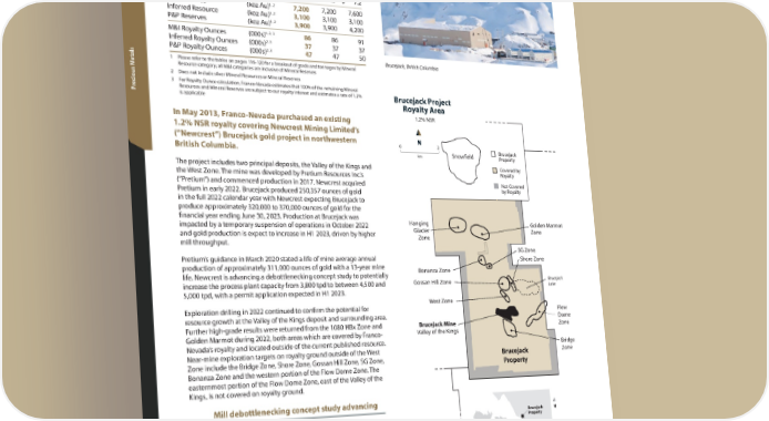 58 TSX / NYSE: FNV Franco-Nevada Corporation Canada Overview Overview Precious Metals Brucejack Location: British Columbia, Canada Operator: Newcrest Mining Limited Precious Metals: Au & Ag Royalty: NSR: 1.2% km 0 2 Vancouver British Columbia Stewart Brucejack Property Brucejack Property Brucejack Lake West Zone Gossan Hill Zone Hanging Glacier Zone Bonanza Zone Flow Dome Zone Bridge Zone Shore Zone Golden Marmot Zone SG Zone Snowfield Brucejack Mine Valley of the Kings Brucejack Project Royalty Area 1.2% NSR Brucejack Property Covered by Royalty Not Covered by Royalty 2022 2021 2020 Revenue to Franco-Nevada ($ million) $ 5.8 $ 7.0 $ 7.2 M&I Resource (koz Au) 1, 2 7,200 7,200 7,600 Inferred Resource (koz Au) 1, 2 3,100 3,100 3,100 P&P Reserves (koz Au) 1, 2 3,900 3,900 4,200 M&I Royalty Ounces (000s) 1, 2, 3 86 86 91 Inferred Royalty Ounces (000s) 2, 3 37 37 37 P&P Royalty Ounces (000s) 2, 3 47 47 50 1 Please refer to the tables on pages 116-120 for a breakout of grade and tonnages by Mineral Resource category; all M&I categories are inclusive of Mineral Reserves 2 Does not include silver Mineral Resources or Mineral Reserves 3 For Royalty Ounce calculation, Franco-Nevada estimates that 100% of the remaining Mineral Resources and Mineral Reserves are subject to our royalty interest and estimates a rate of 1.2% is applicable In May 2013, Franco-Nevada purchased an existing 1.2% NSR royalty covering Newcrest Mining Limited’s (“Newcrest”) Brucejack gold project in northwestern British Columbia. The project includes two principal deposits, the Valley of the Kings and the West Zone. The mine was developed by Pretium Resources Inc.’s (“Pretium”) and commenced production in 2017. Newcrest acquired Pretium in early 2022. Brucejack produced 250,357 ounces of gold in the full 2022 calendar year with Newcrest expecting Brucejack to produce approximately 320,000 to 370,000 ounces of gold for the financial year ending June 30, 2023. Production at Brucejack was impacted by a temporary suspension of operations in October 2022 and gold production is expect to increase in H1 2023, driven by higher mill throughput. Pretium’s guidance in March 2020 stated a life of mine average annual production of approximately 311,000 ounces of gold with a 13-year mine life. Newcrest is advancing a debottlenecking concept study to potentially increase the process plant capacity from 3,800 tpd to between 4,500 and 5,000 tpd, with a permit application expected in H1 2023. Exploration drilling in 2022 continued to confirm the potential for resource growth at the Valley of the Kings deposit and surrounding area. Further high-grade results were returned from the 1080 HBx Zone and Golden Marmot during 2022, both areas which are covered by Franco- Nevada’s royalty and located outside of the current published resource. Near-mine exploration targets on royalty ground outside of the West Zone include the Bridge Zone, Shore Zone, Gossan Hill Zone, SG Zone, Bonanza Zone and the western portion of the Flow Dome Zone. The easternmost portion of the Flow Dome Zone, east of the Valley of the Kings, is not covered on royalty ground. Mill debottlenecking concept study advancing High-grade results from Golden Marmot and 1080 HBx Zone on royalty ground Brucejack, British Columbia