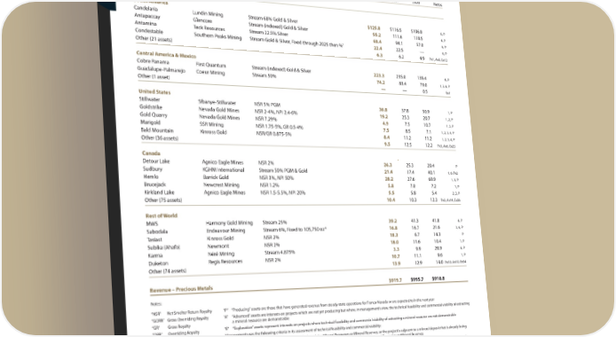 Overview Asset Portfolio w vie er Precious Metals v O Revenue ($ millions) Asset Operator Interest and % (Gold unless otherwise noted) 2022 2021 2020 Notes Precious Metals South America Candelaria Lundin Mining Stream 68% Gold & Silver $125.8 $116.5 $106.8 6, P Antapaccay Glencore Stream (indexed) Gold & Silver 95.2 111.6 118.5 6, P Antamina Teck Resources Stream 22.5% Silver 68.4 94.1 57.0 6, P 7 6, P Condestable Southern Peaks Mining Stream Gold & Silver, Fixed through 2025 then % 22.4 22.5 — Other (21 assets) 6.3 6.2 4.9 Px1, Ax8, Ex12 Central America & Mexico Cobre Panama First Quantum Stream (indexed) Gold & Silver 223.3 235.0 135.4 6, P Guadalupe-Palmarejo Coeur Mining Stream 50% 74.2 83.4 79.0 1, 3, 6, P Other (1 asset) — — 0.5 Ex1 United States Stillwater Sibanye-Stillwater NSR 5% PGM 36.8 57.8 50.9 1, P Goldstrike Nevada Gold Mines NSR 2-4%, NPI 2.4-6% 19.2 25.3 20.7 1, 2, P Gold Quarry Nevada Gold Mines NSR 7.29% 4.9 7.5 10.7 1, 3, P Marigold SSR Mining NSR 1.75-5%, GR 0.5-4% 7.5 8.5 7.1 1, 2, 3, 4, P Bald Mountain Kinross Gold NSR/GR 0.875-5% 8.4 11.2 11.2 1, 2, 3, 4, P Other (36 assets) 9.5 12.5 12.2 Px5, Ax6, Ex25 Canada Detour Lake Agnico Eagle Mines NSR 2% 26.3 25.3 20.4 P Sudbury KGHM International Stream 50% PGM & Gold 21.4 17.4 40.1 1, 6, Px2 Hemlo Barrick Gold NSR 3%, NPI 50% 28.2 27.6 69.9 1, 5, P Brucejack Newcrest Mining NSR 1.2% 5.8 7.0 7.2 1, P Kirkland Lake Agnico Eagle Mines NSR 1.5-5.5%, NPI 20% 5.5 5.8 5.4 2, 3, P Other (75 assets) 10.4 10.3 12.3 Px5, Ax14, Ex56 Rest of World MWS Harmony Gold Mining Stream 25% 39.2 41.3 41.8 6, P 8 3, 6, P Sabodala Endeavour Mining Stream 6%, Fixed to 105,750 oz 16.8 16.7 21.6 Tasiast Kinross Gold NSR 2% 18.3 6.7 14.3 P Subika (Ahafo) Newmont NSR 2% 18.0 11.6 10.4 1, P Karma Néré Mining Stream 4.875% 3.3 9.9 28.9 6, P Duketon Regis Resources NSR 2% 10.7 11.1 9.6 1, P Other (74 assets) 13.9 12.9 14.0 Px10, Ax10, Ex54 Revenue – Precious Metals $919.7 $995.7 $910.8 Notes: “NSR” Net Smelter Return Royalty “P” “Producing” assets are those that have generated revenue from steady-state operations for Franco-Nevada or are expected to in the next year “GORR” Gross Overriding Royalty “A” “Advanced” assets are interests on projects which are not yet producing but where, in management’s view, the technical feasibility and commercial viability of extracting “GR” Gross Royalty a mineral resource are demonstrable “ORR” Overriding Royalty “E” “Exploration” assets represent interests on projects where technical feasibility and commercial viability of extracting a mineral resource are not demonstrable “FH” Freehold or Lessor Royalty Management uses the following criteria in its assessment of technical feasibility and commercial viability: “NPI” Net Profits Interest (i) Geology: there is a known mineral deposit which contains Mineral Resources or Mineral Reserves; or the project is adjacent to a mineral deposit that is already being “NRI” Net Royalty Interest mined or developed and there is sufficient geologic certainty of converting the deposit into Mineral Resources or Mineral Reserves “WI” Working Interest (ii) Accessibility and authorization: there are no significant unresolved issues impacting the accessibility and authorization to develop or mine the mineral deposit, and social, environmental and governmental permits and approvals to develop or mine the mineral deposit appear obtainable 8 Franco-Nevada Corporation TSX / NYSE: FNV
