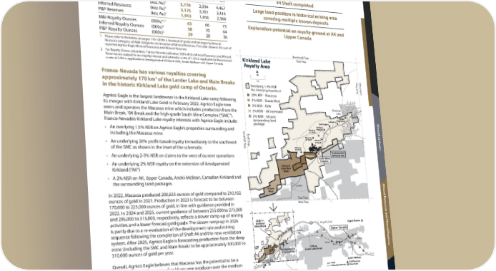 Canada Kirkland Lake Location: Ontario, Canada Franco-Nevada’s 2% NSR royalty, covering a number of claims held by Operator: Agnico Eagle Mines Limited Agnico Eagle from its acquisition of Osisko Mining Corporation in April Precious Metals: Au 2014, covers the AK, Upper Canada, Anoki-McBean and Canadian Kirkland Royalty: NSR: 1.5-5.5%; NPI: 20% deposits. Work is ongoing to evaluate the potential to develop Upper Canada and Anoki-McBean as potential ore feed to existing milling infrastructure in the region. 2022 2021 2020 #4 Shaft completed Revenue to Franco-Nevada ($ million) $ 5.5 $ 5.8 $ 5.4 M&I Resource (koz Au)1 3,770 3,934 4,467 Large land position in historical mining area Inferred Resource (koz Au)1 3,175 3,781 3,414 covering multiple known deposits P&P Reserves (koz Au)1 1,913 1,856 2,368 1, 2 Exploration potential on royalty ground at AK and M&I Royalty Ounces (000s) 63 66 73 2 Inferred Royalty Ounces (000s) 58 70 64 Upper Canada 2 P&P Royalty Ounces (000s) 29 28 36 1 Please refer to the tables on pages 116-120 for a breakout of grade and tonnages by Mineral Resource category; all M&I categories are inclusive of Mineral Reserves. The table above is the sum of reported Agnico Eagle Mineral Resources and Mineral Reserves Bernhardt Twp. 2 For Royalty Ounce calculation, Franco-Nevada estimates 100% of the Mineral Resources and Mineral Kirkland Lake Teck Twp. Reserves are subject to our royalty interest and estimates a rate of 1.5% is applicable to Macassa and a rate of 2.0% is applicable to Amalgamated Kirkland (AK), Anoki-McBean and Upper Canada Royalty Area Franco-Nevada has various royalties covering 0 N 1 . . 2 km wp wp approximately 170 km of the Larder Lake and Main Breaks Overlying 1.5% NSR eck T ebel T in the historic Kirkland Lake gold camp of Ontario. Plus Underlying Royalties of: T L 20% NPI – Macassa Agnico Eagle is the largest landowner in the Kirkland Lake camp following 2% NSR – Gracie West its merger with Kirkland Lake Gold in February 2022. Agnico Eagle now 3% NSR – KLW Kirkland owns and operates the Macassa mine which includes production from the 2% NSR – AK extension Lake Main Break, ’04 Break and the high-grade South Mine Complex (“SMC”). 2% NSR – AK and Wright- surrounding land LakeshoreHargreaves Franco-Nevada’s Kirkland Lake royalty interests with Agnico Eagle include: Teck-Hughes D package iv Kirkland ersified A • An overlying 1.5% NSR on Agnico Eagle’s properties surrounding and Macassa Minerals Gr T #1 Shaft including the Macassa mine enf eck T Macassa ell T wp #2 Shaft Macassa ssets • An underlying 20% profit-based royalty immediately to the southwest #4 Shaft wp . Macassa of the SMC as shown in the inset of the schematic . #3 Shaft Amalgamated • An underlying 2-3% NSR on claims to the west of current operations Macassa Kirkland (AK) South Mine • An underlying 2% NSR royalty on the extension of Amalgamated Complex Kirkland Kirkland (“AK”) Lake West (KLW) • A 2% NSR on AK, Upper Canada, Anoki-McBean, Canadian Kirkland and the surrounding land packages Swastika M Gracie iner In 2022, Macassa produced 200,833 ounces of gold compared to 210,192 West ounces of gold in 2021. Production in 2023 is forecast to be between Teck Twp. al R 170,000 to 225,000 ounces of gold, in line with guidance provided in Otto Twp. esour 2022. In 2024 and 2025, current guidance of between 255,000 to 275,000 c and 295,000 to 315,000, respectively, reflects a slower ramp-up of mining es and M activities and a lower forecast gold grade. The slower ramp-up in 2024 24 M oz. Kirkland 66 King Kirkland Upper Beaver is partly due to a re-evaluation of the development rate and mining Main Break iner sequence following the completion of Shaft #4 and the new ventilation Kirkland Upper Canada system. After 2025, Agnico Eagle is forecasting production from the deep Lake al R mine (including the SMC and Main Break) to be approximately 300,000 to Dobie eser 180 East v 310,000 ounces of gold per year. Amalgamated 13 M oz. Biroco Esker es Kirkland (AK) Larder Lake Break Overall, Agnico Eagle believes that Macassa has the potential to be a Swastika 320,000 to 350,000 ounces of gold per year producer over the medium Anoki-McBean Fault Gold Showings term including prospects closer to surface. Both the AK and the Near Mineralized Breaks Mine Shafts Surface Deposits at Macassa are accessible from an existing surface ramp at Macassa. Production from the Near Surface deposits is expected to A begin in 2023 and production from the AK deposit could potentially dditional I begin in 2024. Average annual production from these two deposits Ontario Kirkland Quebec could be 20,000 to 40,000 ounces of gold, commencing in 2024. Drilling Lake is planned to continue at AK in 2023 from underground platforms, nf with a focus on continuing to upgrade and increase the Indicated orma Mineral Resource. tion TSX / NYSE: FNV Franco-Nevada Corporation 59
