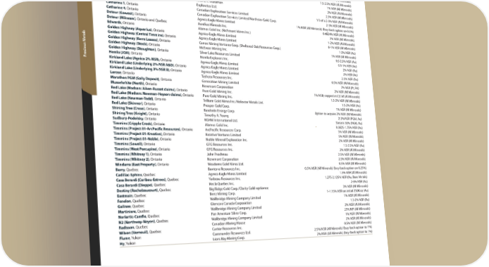 84 TSX / NYSE: FNV Franco-Nevada Corporation Overview Overview Precious Metals Asset Operator Interest and % 1 Canada Spences Bridge (Talisker) , British Columbia Talisker Resources Ltd. 2.5% NSR (All Minerals) Spences Bridge (Westhaven) , British Columbia Westhaven Gold Corp. 2% NSR (All Minerals) Taken , British Columbia Independence Gold Corp. 2-4% NSR (All Minerals) (buy-back option to 1%) Tide , British Columbia 0945473 B.C. Ltd. 1.5% NSR (All Minerals) Maverick (Nokomis) , Manitoba Minnova Corp. 2-3% NSR (All Minerals) Maverick (Puffy Lake) , Manitoba Minnova Corp. 2-3% NSR (All Minerals) Oxford Lake , Manitoba Alto Ventures Ltd. 1.5-2.5% NSR (All Minerals) Clarence Stream , New Brunswick Galway Metals Inc. 1% NSR (All Minerals) Clan Lake (Sito Lake) , Northwest Territories Roland T. Trenaman 2% NSR (All Minerals) Hyde , Nunavut Exploratus Ltd. 2.5% NSR (All Minerals) Catharine 1 , Ontario Canadian Exploration Services Limited 1/3 of a 2-3% NSR (All Minerals) Catharine 4 , Ontario Canadian Exploration Services Limited/Northstar Gold Corp. 2-3% NSR (All Minerals) Detour (Gowest) , Ontario Agnico Eagle Mines Limited 1% NSR (All Minerals) (buy-back option on 0.5%) Detour (Mikwam) , Ontario and Quebec Aurelius Minerals Inc. 0.4824% NSR (All Minerals) Edwards , Ontario Alamos Gold Inc. (Richmont Mines Inc.) 2% NSR (All Minerals) Golden Highway (Aquarius) , Ontario Agnico Eagle Mines Limited 1-2% NSR (All Minerals) Golden Highway (Central Timmins) , Ontario Agnico Eagle Mines Limited 0-1% NSR (All Minerals) Golden Highway (Kerrs Leases) , Ontario Canoe Mining Ventures Corp. (Sheltered Oak Resources Corp.) 1-2% NSR (Au) Golden Highway (Stock) , Ontario McEwen Mining Inc. 1% NSR (All Minerals) Golden Highway (Stoughton) , Ontario Silver Lake Resources Limited 0.5-2.5% NSR (Au) Hemlo (JOA) , Ontario Hemlo Explorers Inc. 0.5-1% NSR (Au) Kirkland Lake (Agnico 2% NSR) , Ontario Agnico Eagle Mines Limited 2% NSR (Au) Kirkland Lake (Underlying 2% NSR A&D) , Ontario Agnico Eagle Mines Limited 2% NSR (Au) Kirkland Lake (Underlying 3% NSR B) , Ontario Agnico Eagle Mines Limited 2-3% NSR (Au) Larose , Ontario Tashota Resources Inc. 0.5% NSR (All Minerals) Marathon PGM (Sally Deposit) , Ontario Generation Mining Limited 2% NSR (Pt, Pd) Musselwhite (North) , Ontario Newmont Corporation 2% NSR (All Minerals) Red Lake (Madsen: Aiken-Russet claims) , Ontario Pure Gold Mining Inc. 1% NSR; capped at C$1M (All Minerals) Red Lake (Madsen: Newman-Heyson claims) , Ontario Pure Gold Mining Inc. 1.5-2% NSR (All Minerals) Red Lake (Newman-Todd) , Ontario Trillium Gold Mines Inc./Heliostar Metals Ltd. 1.5-2% NSR (Au) Red Lake (Skinner) , Ontario Prosper Gold Corp. 1% NSR (All Minerals) Shining Tree (Creso) , Ontario Baselode Energy Corp. Option to acquire 2% NSR (All Minerals) Shining Tree (Knight) , Ontario Timothy A. Young 2-3% NSR (PGM, Au) Sudbury-Podolsky , Ontario KGHM International Ltd. Stream 50% (PGM, Au) Timmins (Cripple Creek) , Ontario Alamos Gold Inc. 0.3825-1.75% NSR (Au) Timmins (Project 81-ArcPacific Resources) , Ontario ArcPacific Resources Corp. 5% NSR (All Minerals) Timmins (Project 81-Kreative) , Ontario Kreative Ventures Limited 5% NSR (All Minerals) Timmins (Project 81-Noble) , Ontario Noble Mineral Exploration Inc. 2% NSR (All Minerals) Timmins (Sewell) , Ontario GFG Resources Inc. 1.5-2.5% NSR (Au) Timmins (West Porcupine) , Ontario GFG Resources Inc. 2% NSR (All Minerals) Timmins (Whitney 1) , Ontario John Prochnau 2.5% NSR (All Minerals) Timmins (Whitney 2) , Ontario Newmont Corporation 2.5% NSR (All Minerals) Windarra (East Property) , Ontario Wesdome Gold Mines Ltd. 0.5% NSR (All Minerals) Barry , Quebec Bonterra Resources Inc. 0.5% NSR (All Minerals) (buy-back option on 0.25%) Cadillac-Sphinx , Quebec Agnico Eagle Mines Limited 1.5% NSR (All Minerals) Casa Berardi (Caribou-Estrees) , Quebec Yorbeau Resources Inc. 1.275-2.125% NSR (Au, Base Metals) Casa Berardi (Dieppe) , Quebec Hecla Quebec Inc. 2-3% NSR (Au) Destiny (Rochebaucourt) , Quebec Big Ridge Gold Corp./Clarity Gold-optionee 3% NSR (All Minerals) Eastmain , Quebec Benz Mining Corp. 1-1.15% NSR on initial 250K oz (Au) Fenelon , Quebec Wallbridge Mining Company Limited 1% NSR (All Minerals) Galinee , Quebec Glencore Canada Corporation 1.5-2% NSR (Au) Martiniere , Quebec Wallbridge Mining Company Limited 2% NSR (All Minerals) Norlartic-Camflo , Quebec Pan American Silver Corp. 25% NPI (All Minerals) N2 (Northway-Noyon) , Quebec Wallbridge Mining Company Limited 1% NSR (All Minerals) Radisson , Quebec Canadian Mining House 2% NSR (All Minerals) Wilson (Verneuil) , Quebec Cartier Resources Inc. 0.5% NSR (All Minerals) Flume , Yukon Commander Resources Ltd. 2.5% NSR (All Minerals) (buy-back option to 1%) Hy , Yukon Lions Bay Mining Corp. 2% NSR (All Minerals) (buy-back option to 1%) Precious Metals Exploration Assets