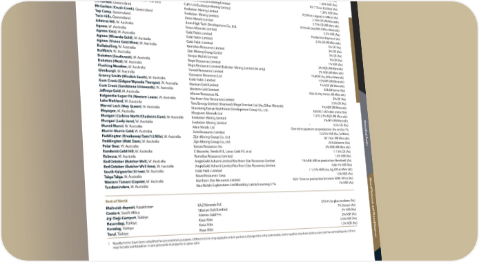 Precious Metals Exploration Assets Asset Operator Interest and %1 Australia Brown’s Creek, New South Wales Australian Native Landscapes/Hargraves Resources NL 2.25% NSR (All Minerals) Brown’s Creek (Blayney), New South Wales Regis Resources Limited 2.25% NSR (All Minerals) Brocks Creek (Zapopan), Northern Territory Agnico Eagle Mines Limited A$20/oz (Au) Reynolds Range, Northern Territory Prodigy Gold NL 1-2.5% NSR (Au) Rover, Northern Territory Castile Resources Limited 1.5-2.5% NSR (All Minerals) Spring Hill, Northern Territory PC Gold Pty Ltd A$5.70-13.30/oz (Au) Tennant Creek, Northern Territory Emmerson Resources Limited 1.29% NSR (Au) Tennant Creek (Chariot), Northern Territory Emmerson Resources Limited A$17.10 or A$30/oz (Au) Tennant Creek-Evolution, Northern Territory CuFe Ltd/Evolution Mining Limited 1.29% NSR (Au) Tennant Creek (Orlando), Northern Territory CuFe Ltd/Evolution Mining Limited A$30/oz; capped at 64K oz (Au) Mt Carlton, Queensland Evolution Mining Limited 2.75% GR (All Minerals) Mt Carlton (Crush Creek), Queensland Evolution Mining Limited 2.75% GR (All Minerals) Top Camp, Queensland Orion Metals Limited 0.5% GR (Au)/NPI (Other Minerals) Twin Hills, Queensland Jinan High-Tech Development Co., Ltd. 2.5% NSR (Au) Admiral Hill, W. Australia Focus Minerals Limited Production Payment (Au) Agnew, W. Australia Gold Fields Limited 2.5% GR (All Minerals) Agnew (Cox), W. Australia Gold Fields Limited 5% GR (Au) Agnew (Miranda Gold), W. Australia Gold Fields Limited 3% GR (Au) Agnew (Vivien Gold Mine), W. Australia Ramelius Resources Limited 3% GR (Au) Bullabulling, W. Australia Zijin Mining Group Co Ltd 1% GR (Au) Bullfinch, W. Australia Torque Metals Limited 1% NSR (Au) Duketon (Southwest), W. Australia Regis Resources Limited 2% NSR (All Minerals) Duketon (West), W. Australia Regis Resources Limited/Duketon Mining Limited (Ni only) 2% NSR (All Minerals) Flushing Meadow, W. Australia Yandal Resources Limited 1% NSR (Au, Other Minerals) Glenburgh, W. Australia Gascoyne Resources Ltd 1.5% NPI (All Minerals) Granny Smith (Windich South), W. Australia Gold Fields Limited 1% NSR (All Minerals) Gum Creek (Gidgee/Wyooda Thangoo), W. Australia Horizon Gold Limited A$0.60/tonne (Au) Gum Creek (Sandstone II/Howards), W. Australia Horizon Gold Limited A$0.35/dry tonne (All Minerals) Jeffreys Gold, W. Australia Mincor Resources NL 2% GP (Au) Kalgoorlie Super Pit (Western Lease), W. Australia Northern Star Resources Limited 2.5% GR (Au) Lake Maitland, W. Australia Toro Energy Limited (Uranium)/Mega Uranium Ltd (Au, Other Minerals) 1% NSR (All Minerals) Marvel Loch (May Queen), W. Australia Shandong Tianye Real Estate Development Group Co., Ltd. A$0.50-1.00/cubic metre (Au) Moyagee, W. Australia Musgrave Minerals Ltd 1.575-2.1% NSR (All Minerals) D Mungari (Carbine North/Chadwin’s Dam), W. Australia Evolution Mining Limited 3% NPI (All Minerals) iv Mungari (Lady Jane), W. Australia Evolution Mining Limited 4.5% GR (Au) ersified A Munni Munni, W. Australia Alien Metals Ltd One-time payment on production (Au and/or Pt) Murrin Murrin Gold, W. Australia Zeta Resources Limited 2.625% NSR (Au, Sulfides) Paddington (Breakaway Dam/12 Mile), W. Australia Zijin Mining Group Co., Ltd. A$1/ton (All Minerals) ssets Paddington (Matt Dam), W. Australia Zijin Mining Group Co., Ltd. A$0.60/tonne (Au) Polar Bear, W. Australia Karora Resources Inc. 2% NSR (All Minerals) Randwick Gold Hill, W. Australia E Bouverie, Trindal P/L, Lucas Gold P/L et al 1-1.5% GR (Au) Rebecca, W. Australia Ramelius Resources Limited 1.5% NSR (Au) Red October (Butcher Well), W. Australia AngloGold Ashanti Limited/Northern Star Resources Limited 1% NSR; 50K oz production threshold (Au) Red October (Butcher Well Area), W. Australia AngloGold Ashanti Limited/Northern Star Resources Limited 0.68-1% NSR (Au) South Kalgoorlie (St Ives), W. Australia Gold Fields Limited 1-1.75% NSR (Au, Ag, Other Minerals) Talga Talga, W. Australia Novo Resources Corp. 1.5% NSR (Au) Western Tamani (Coyote), W. Australia Northern Star Resources Limited A$5-15/oz on production between 300K-1M oz (Au) M Yundamindera, W. Australia Nex Metals Explorations Ltd/Metalcity Limited-earning 51% 1% NSR (Au) iner al R Rest of World esour Maibulak deposit, Kazakhstan KAZ Minerals PLC $10.41/oz plus escalator (Au) c Cooke 4, South Africa Sibanye Gold Limited 7% Stream (Au) es and M Aği Daği-Camyurt, Türkiye Alamos Gold Inc. 2% NSR (Au) Hasandagi, Türkiye Koza Altin 2% NSR (Au) Karadag, Türkiye Koza Altin 2.5% NSR (Au) iner Torul, Türkiye Koza Altin 1.5% NSR (Au) al R 1 Royalty terms have been simplified for presentation purposes. Different terms may apply to certain portions of properties or by commodity. Some royalties may have sliding scales tied to commodity price. Others eser v may include participation in sale proceeds of property or gross sales es A dditional I nf orma tion TSX / NYSE: FNV Franco-Nevada Corporation 85