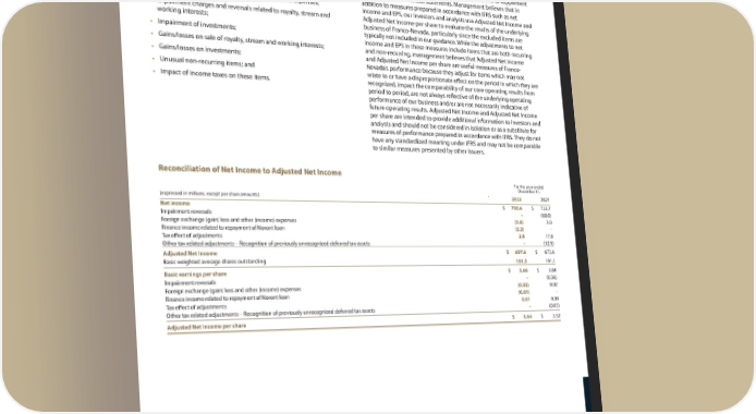 129 Franco-Nevada Corporation TSX / NYSE: FNV Additional Information Adjusted Net Income and Adjusted Net Income per Share Adjusted Net Income and Adjusted Net Income per share are non-GAAP financial measures, which is defined by Franco-Nevada by excluding the following from net income (loss) and EPS: • Foreign exchange gains/losses and other income/expenses; • Impairment charges and reversals related to royalty, stream and working interests; • Impairment of investments; • Gains/losses on sale of royalty, stream and working interests; • Gains/losses on investments; • Unusual non-recurring items; and • Impact of income taxes on these items. Management uses Adjusted Net Income and Adjusted Net Income per share to evaluate the underlying operating performance of Franco- Nevada as a whole for the reporting periods presented, to assist with the planning and forecasting of future operating results, and to supplement information in its financial statements. Management believes that in addition to measures prepared in accordance with IFRS such as net income and EPS, our investors and analysts use Adjusted Net Income and Adjusted Net Income per share to evaluate the results of the underlying business of Franco-Nevada, particularly since the excluded items are typically not included in our guidance. While the adjustments to net income and EPS in these measures include items that are both recurring and non-recurring, management believes that Adjusted Net Income and Adjusted Net Income per share are useful measures of Franco- Nevada’s performance because they adjust for items which may not relate to or have a disproportionate effect on the period in which they are recognized, impact the comparability of our core operating results from period to period, are not always reflective of the underlying operating performance of our business and/or are not necessarily indicative of future operating results. Adjusted Net Income and Adjusted Net Income per share are intended to provide additional information to investors and analysts and should not be considered in isolation or as a substitute for measures of performance prepared in accordance with IFRS. They do not have any standardized meaning under IFRS and may not be comparable to similar measures presented by other issuers. Reconciliation of Net Income to Adjusted Net Income For the year ended December 31, (expressed in millions, except per share amounts) 2022 2021 Net income $ 700.6 $ 733.7 Impairment reversals – (68.0) Foreign exchange (gain) loss and other (income) expenses (3.6) 3.0 Finance income related to repayment of Noront loan (2.2) – Tax effect of adjustments 2.8 17.8 Other tax related adjustments – Recognition of previously unrecognized deferred tax assets – (12.9) Adjusted Net Income $ 697.6 $ 673.6 Basic weighted average shares outstanding 191.5 191.1 Basic earnings per share $ 3.66 $ 3.84 Impairment reversals – (0.36) Foreign exchange (gain) loss and other (income) expenses (0.02) 0.02 Finance income related to repayment of Noront loan (0.01) – Tax effect of adjustments 0.01 0.09 Other tax related adjustments – Recognition of previously unrecognized deferred tax assets – (0.07) Adjusted Net Income per share $ 3.64 $ 3.52