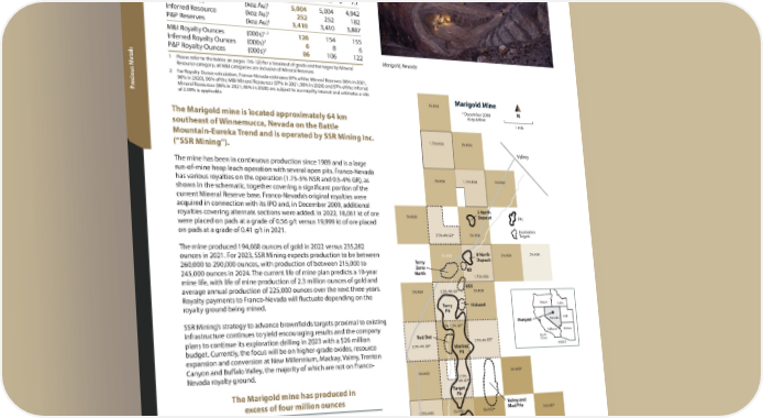United States Marigold Location: Nevada, United States ww Operator: SSR Mining Inc. vievie Precious Metals: Au erer Royalty: NSR: 1.75-5% / GR: 0.5-4% vv OO 2022 2021 2020 Revenue to Franco-Nevada ($ million) $ 7.5 $ 8.5 $ 7.1 M&I Resource (koz Au)1 5,004 5,004 4,942 Inferred Resource (koz Au)1 252 252 182 P&P Reserves (koz Au)1 3,410 3,410 3,887 1, 2 M&I Royalty Ounces (000s) 126 154 155 2 Inferred Royalty Ounces (000s) 6 8 6 2 P&P Royalty Ounces (000s) 86 106 122 Marigold, Nevada etals 1 Please refer to the tables on pages 116-120 for a breakout of grade and tonnages by Mineral Resource category; all M&I categories are inclusive of Mineral Reserves 2 For Royalty Ounce calculation, Franco-Nevada estimates 97% of the Mineral Reserves (96% in 2021, 98% in 2020), 96% of the M&I Mineral Resources (97% in 2021, 98% in 2020) and 97% of the Inferred ecious M Mineral Resources (96% in 2021, 98% in 2020) are subject to our royalty interest and estimates a rate r of 2.59% is applicable Marigold Mine P 5% NSR 5% NSR * December 2009 N The Marigold mine is located approximately 64 km Acquisition 1 mile southeast of Winnemucca, Nevada on the Battle Mountain-Eureka Trend and is operated by SSR Mining Inc. 1.75% NSR 5% NSR 1.75% NSR 5% NSR (“SSR Mining”). Valmy Valmy The mine has been in continuous production since 1989 and is a large run-of-mine heap leach operation with several open pits. Franco-Nevada 5% NSR 1.75% NSR 5% NSR 5% NSR 1.75% NSR 5% NSR has various royalties on the operation (1.75-5% NSR and 0.5-4% GR), as shown in the schematic, together covering a significant portion of the current Mineral Reserve base. Franco-Nevada’s original royalties were acquired in connection with its IPO and, in December 2009, additional 5 North 5 North royalties covering alternate sections were added. In 2022, 18,061 kt of ore 5% NSR Deposit N 5% NSR Deposit Pits were placed on pads at a grade of 0.56 g/t versus 19,999 kt of ore placed on pads at a grade of 0.41 g/t in 2021. 1 Mile Exploration 2.5%-4% GR* 5% NSR 2.5%-4% GR* 5% NSR Targets The mine produced 194,668 ounces of gold in 2022 versus 235,282 8 North 5% NSR 8 North 5% NSR ounces in 2021. For 2023, SSR Mining expects production to be between 5% NSR Deposit 5% NSR 5% NSR Deposit 5% NSR Terry Terry 260,000 to 290,000 ounces, with production of between 215,000 to Zone 8D Zone 8D 245,000 ounces in 2024. The current life of mine plan predicts a 10-year North North 1.75% NSR 1.75% NSR mine life, with life of mine production of 2.3 million ounces of gold and 8SX 8SX average annual production of 225,000 ounces over the next three years. 5% NSR 2.5%-4% GR* 5% NSR 5% NSR 2.5%-4% GR* 5% NSR Royalty payments to Franco-Nevada will fluctuate depending on the Marigold royalty ground being mined. Oregon Idaho Terry Hideout Mine Terry Hideout Pit Pit SSR Mining’s strategy to advance brownfields targets proximal to existing Nevada Utah *December 2009 Marigold 0.5%-1.5% GR* Acquisition 0.5%-1.5% GR* infrastructure continues to yield encouraging results and the company Red Dot Red Dot California Arizona plans to continue its exploration drilling in 2023 with a $26 million Pacific 2.5%-4% GR* 2.5%-4% GR* Ocean 2.5%-4% GR* 2.5%-4% GR* budget. Currently, the focus will be on higher-grade oxides, resource MEXICO Mackay Pits Mackay Pit Pit expansion and conversion at New Millennium, Mackay, Valmy, Trenton Exploration Canyon and Buffalo Valley, the majority of which are not on Franco- Nevada royalty ground. Targets 5% NSR 3% NSR* 5% NSR 3% NSR* 2.5%- 2.5%- 4% GR* 4% GR* The Marigold mine has produced in Target Target Pit excess of four million ounces Pit Valmy and Valmy and 1.75% NSR 5% NSR 3% NSR* Mud Pits 3% NSR* 1.75% NSR 5% NSR 3% NSR* Mud Pits 3% NSR* Continued resource expansion and encouraging exploration results E. Basalt Schematic E. Basalt Schematic Antler and and Battle Cry Representation Antler and and Battle Cry Representation 1.75% NSR Basalt Pits Targets Only 1.75% NSR Basalt Pits Targets Only (Backfilled) (Backfilled) 44 Franco-Nevada Corporation TSX / NYSE: FNV