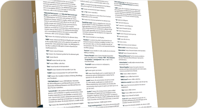 132 TSX / NYSE: FNV Franco-Nevada Corporation Additional Information Overview Precious Metals Diversified Assets Mineral Resources and Mineral Reserves Additional Information Glossary “ A$ ” means Australian dollars. “ Adjusted EBITDA ” and “ Adjusted EBITDA per share ” are non-IFRS measures, which exclude the following from net income and earnings per share: income tax expense/ recovery; finance expenses and finance income; depletion and depreciation; non-cash costs of sales; impairment charges related to royalty, stream and working interests and investments; gains/losses on the sale of royalty, stream and working interests and investments; foreign exchange gains/losses and other income/expenses; and unusual non-recurring items. For additional information and a reconciliation of these measures to various IFRS measures, refer to the Company’s MD&A. “ Adjusted Net Income ” and “ Adjusted Net Income per share ” are non-IFRS financial measures, which exclude the following from net income and earnings per share: impairment charges related to royalty, stream and working interests and investments; gains/losses on the sale of royalty, stream and working interests and investments; foreign exchange gains/losses and other income/ expenses; unusual non-recurring items; and the impact of income taxes on these items. For additional information and a reconciliation of these measures to various IFRS measures, refer to the Company’s MD&A. “ Ag ” means the chemical symbol for the element silver. “ AMR ” means Advanced Minimum Royalty and is rent paid to the royalty holder prior to the payment of royalties on production. Once production begins, the AMR payments are then credited in full against stream of production royalty payments. “ AOI ” means area of interest. “ Au ” means the chemical symbol for the element gold. “ bbl ” means barrel. “ Bbls/d ” means barrels per day. “ Bcf ” means billion cubic feet. “ Boe ” mean barrels of oil equivalent. “ Boe/d ” means barrels of oil equivalent per day. “ CAGR ” means Compounded Annual Growth Rate. “ CIM ” means the Canadian Institute of Mining, Metallurgy and Petroleum. “ CIM Definitions ” means CIM Definition Standards for Mineral Resources and Mineral Reserves and CIM Estimation of Mineral Resources and Mineral Reserves Best Practice Guidelines. “ concentrate ” is the product of physical concentration process, such as flotation or gravity concentration, which involves separating ore minerals from unwanted waste rock. Concentrates require subsequent processing (such as smelting or leaching) to break down or dissolve the ore minerals and obtain the desired elements, usually metals. “ Cu ” means the chemical symbol for the element copper. “ cut-off grade ” means the lowest grade of Mineral Resource considered economic; used in the calculation of Mineral Resources and Mineral Reserves in a given deposit. “ Indicated Resources ” has the meaning ascribed to the term “Indicated Mineral Resource” pursuant to CIM Definitions. “ Inf ” means Inferred. “ Inferred Resources ” has the meaning ascribed to the term “ Inferred Mineral Resource ” pursuant to CIM Definitions. “ JORC ” means the Australasian Code for Reporting of Mineral Resources and Mineral Reserves prepared by the Joint Ore Reserves Committee of the Australasian Institute of Mining and Metallurgy, Australian Institute of Geoscientists and Mineral Council of Australia, as amended. “ kg ” represents kilogram. “ km ” represents kilometre. “ km 2 ” represents square kilometre. “ koz ” means thousand ounces. “ kt ” means thousand tonnes. “ ktpd ” means thousand tonnes per day “ lb ” represents pound. “ LOM ” means life of mine. “ m ” means metres. “ M&I ” means Measured and Indicated. “ Mbbls/mbbls ” means thousand barrels. “ Mboe/mboe ” means thousand barrels of oil equivalent. “ Mcf/mcf ” means thousand cubic feet. “ Measured Resources ” has the meaning ascribed to the term “Measured Mineral Resource” pursuant to CIM Definitions. “ mineralization ” usually implies minerals of value occurring in rocks. “ Mineral Royalties ” means the royalty interests in precious and base metal properties and certain equity interests owned by Franco-Nevada. “ Mlbs ” means millions of pounds. “ MMbbl ” means million barrels of oil. “ MMcf/mmcf ” means million cubic feet. “ MMcf/d or mmcf/d ” means million cubic feet per day. “ Mo ” means the chemical symbol for the element molybdenum. “ Moz ” means million ounces. “ Mtpa ” means million tonnes per annum. “ NGLs ” means Natural Gas Liquids. “ NI 43-101 ” means National Instrument 43-101 – Standards of Disclosure for Mineral Projects of the Canadian Securities Administrators. “ Ni ” means the chemical symbol for the element nickel. “ NPI ” means Net Profit Interest: the profits after deduction of expenses. “ diamond drill ” is a type of drill in which the rock cutting is done by abrasion, with a diamond impregnated bit, rather than by percussion. The drill cuts a core of rock which is recovered in long cylindrical sections. Syn: “ core drill ”. “ dip ” is the angle between a horizontal plane and an inclined surface such as a rock formation, fault or vein. “ drift ” is a horizontal passage underground that follows along the length of a vein of rock formation. “ EIS ” means environmental impact statement. “ eq ” or “ Eq ” means equivalent. “ fault ” means a fracture in a rock where there has been displacement of the two sides. “ Fe ” means the chemical symbol for the element iron. “ feasibility study ” means a comprehensive study of a mineral deposit in which all geological, engineering, legal, operation, economic, social, environmental and other relevant factors are considered in sufficient detail that it could reasonably serve