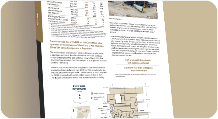32 TSX / NYSE: FNV Franco-Nevada Corporation South America Overview Overview Precious Metals Cerro Moro Location: Argentina, South America Operator: Pan American Silver Corp. Precious Metals: Au & Ag Royalty: NSR: 2% Cerro Moro Royalty Area 2% NSR Royalty Claim Area Not Included Under 2% NSR N km 0 5 Michelle Zoe Deborah Martina Tres Lomas Esperanza Loma Escondida N Buenos Aires Cerro Moro CHILE ARGENTINA BRAZIL BOLIVIA URUGUAY PARAGUAY Carla Elsa Escondida Nini Nini Ext Natalia Natalia NW PLANT faces, which supported the increase in mill feed coming from higher- grade underground ore and stable throughput. Prior to the acquisition, Yamana’s long-term plan at Cerro Moro was to create ten years of sustainable production of at least 160,000 gold equivalent ounces 3 per year. In November 2022, Yamana continued to report exploration success at Cerro Moro. Cerro Moro exploration during 2022 concentrated in the core mine (covered by Franco-Nevada’s royalty) and Naty sectors (not covered by Franco-Nevada’s royalty) with infill drilling targeting extensions of known mineralization both to depth and along strike to replace mining depletion. Yamana was considering both a plant expansion and added heap leach project which, along with conversion of known exploration targets to mineral resources, could produce at least 200,000 gold equivalent ounces 3 per year. High grade gold/silver deposit with expansion potential Significant near-mine and regional exploration targets 3 Please refer to Yamana’s public disclosures for further details on its definition of gold equivalent ounces 2022 2021 2020 Revenue to Franco-Nevada ($ million) $ 6.3 $ 4.9 $ 4.1 M&I Resource (koz Au) 1 574 574 521 Inferred Resource (koz Au) 1 226 226 254 P&P Reserves (koz Au) 1 457 457 431 M&I Resource (Moz Ag) 1 30.0 30.0 30.1 Inferred Resource (Moz Ag) 1 8.2 8.2 8.8 P&P Reserves (Moz Ag) 1 22.2 22.2 23.9 M&I Royalty Ounces (000s) 1, 2 17 18 18 Inferred Royalty Ounces (000s) 2 6 6 7 P&P Royalty Ounces (000s) 2 14 15 15 1 Please refer to the tables on pages 116-120 for a breakout of grade and tonnages by Mineral Resource category; all M&I categories are inclusive of Mineral Reserves 2 For Royalty Ounce calculation, Franco-Nevada estimates 95% of the Mineral Reserves (100% in 2021), 90% of the M&I Mineral Resources (95% in 2021, 95% in 2020) and 90% of the Inferred Mineral Resources (95% in 2021, 95% in 2020) are subject to our royalty interest and estimates a rate of 2.0% is applicable. Silver has been converted assuming $1,800/oz gold and $21.00/oz silver ($1,800/oz gold and $23.00/oz silver in 2021, $1,750/oz gold and $25.00/oz silver in 2020) Franco-Nevada has a 2% NSR on the Cerro Moro mine operated by Pan American Silver Corp. (“Pan American Silver”) in Santa Cruz province, Argentina. The royalty covers approximately 160 km 2 of the property including a significant portion of the mineral resources which are contained in high-grade epithermal gold and silver veins. In March 2023, Pan American Silver acquired Cerro Moro as part of its acquisition of Yamana Gold Inc. (“Yamana”). Construction at Cerro Moro was completed in 2018 with commercial production being declared in June 2018. For 2022, actual production was 108,240 ounces of gold and 6.1 million ounces of silver compared to 79,988 ounces of gold and 5.6 million ounces of silver in 2021. Production continued to benefit from access to additional mining Cerro Moro, Argentina