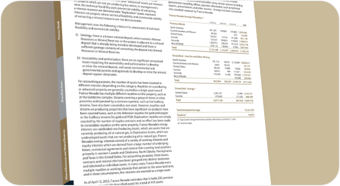 Additional Information Asset Counts Acreage of Assets w vie er Franco-Nevada’s assets are categorized by commodity and stage of The following is a tabulation of the acreage of Precious Metals and v O development. By commodity, assets are characterized as “Precious Metals” Diversified lands subject to Franco Nevada’s royalty, stream or other or “Diversified”. “Precious Metals” includes gold, silver and PGM assets. interests as at March 31, 2023. Acreage amounts are approximate “Diversified” includes iron ore, other mining and energy assets (which or estimated and are compiled from information contained in asset encompass oil, gas and natural gas liquids). “Producing” assets are those agreements and updated when possible using various sources including that have generated revenue from steady-state operations for Franco- government recording offices, operator information such as technical Nevada or are expected to in the next year. “Advanced” assets are interests reports, presentations and other sources. Acreage has been converted on projects which are not yet producing but where, in management’s into standard measure by Franco-Nevada. view, the technical feasibility and commercial viability of extracting a mineral resource are demonstrable. “Exploration” assets represent Franco-Nevada Acreage Tabulation(1) interests on projects where technical feasibility and commercial viability Producing Advanced Exploration Total of extracting a mineral resource are not demonstrable. Precious Metals South America 471,393 359,687 374,800 1,205,880 Management uses the following criteria in its assessment of technical Central America and Mexico 63,763 – 675 64,438 etals feasibility and commercial viability: United States 105,561 73,919 141,668 321,148 Canada 123,347 269,833 914,834 1,308,014 ecious M (i) G eology: there is a known mineral deposit which contains Mineral Australia 1,282,912 330,633 814,233 2,427,778 r Resources or Mineral Reserves; or the project is adjacent to a mineral Rest of World 1,676,132 108,965 52,863 1,837,960 P deposit that is already being mined or developed and there is Total 3,723,108 1,143,037 2,299,073 7,165,218 sufficient geologic certainty of converting the deposit into Mineral Resources or Mineral Reserves. Diversified – Iron Ore and Other Mining (ii) A ccessibility and authorization: there are no significant unresolved South America 731,714 54,516 3,136,384 3,922,614 issues impacting the accessibility and authorization to develop Central America and Mexico 6,605 59,552 – 66,157 United States 29,234 14,900 18,826 62,960 or mine the mineral deposit, and social, environmental and Canada 44,973 494 373,611 419,078 governmental permits and approvals to develop or mine the mineral Australia 173,438 51,445 950,068 1,174,951 deposit appear obtainable. Rest of World – – 265,842 265,842 Total 985,964 180,907 4,744,731 5,911,602 For accounting purposes, the number of assets has been counted in ssets different manners depending on the category. Royalties on a producing Diversified – Energy(2) or advanced property are generally counted as a single asset even if United States 2,262,147 – 53,994 2,316,141 Franco-Nevada has multiple different royalties on the property, such as Canada 615,043 – 313,552 928,595 ersified A at the Goldstrike complex. Streams covering a group of mines in close Total 2,877,190 – 367,546 3,244,736 iv proximity and operated by a common operator, such as the Sudbury D streams, have also been counted as one asset. However, royalties and streams on producing properties that have significant co-products have Total Estimated Acreage 16,321,556 been counted twice, such as the Robinson royalties for gold and copper 2 or the Sudbury streams for gold and PGM. Exploration royalties are simply Total km 66,051 counted by the number of royalty contracts and no effort has been made (1) Represents management’s best available information as at March 31, 2023. to consolidate royalties on the same property. Franco-Nevada’s energy (2) Gross Acreage. es interests are subdivided into Producing Assets, which are assets that are v currently producing oil or natural gas, or Exploration Assets, which are eser undeveloped assets that are not producing oil or natural gas. Franco- al R Nevada’s energy interests consist of a variety of working interests and iner royalty interests which are derived from a large number of underlying leases, contractual agreements and mineral title covering land positions primarily in western Canada and Oklahoma, North Dakota, Pennsylvania es and M and Texas in the United States. For accounting purposes, these leases, c contracts and mineral title have been grouped into distinct land areas esour and tabulated as individual assets. In many cases, Franco-Nevada owns al R multiple royalties or working interests that pertain to the same land area, iner and in these circumstances, the interests are counted as a single asset. M As of April 12, 2023, Franco-Nevada estimates that it holds 230 precious metals assets and 189 diversified assets for a total of 419 assets. Franco-Nevada Asset Counts at April 12, 2023 Precious Metals Diversified Total tiontiontion Producing 44 691 113 Advanced 38 7 45 ormaormaorma Exploration 148 1132 261 nfnfnf Total 230 189 419 1 14 Mining Assets / 55 Energy Assets dditional Idditional Idditional I 2 86 Mining Assets / 27 Energy Assets AAA 122122 FFrrancancoo-Nev-Nevada Cada Cororporporaationtion TTSX / NSX / NYYSE: FNVSE: FNV