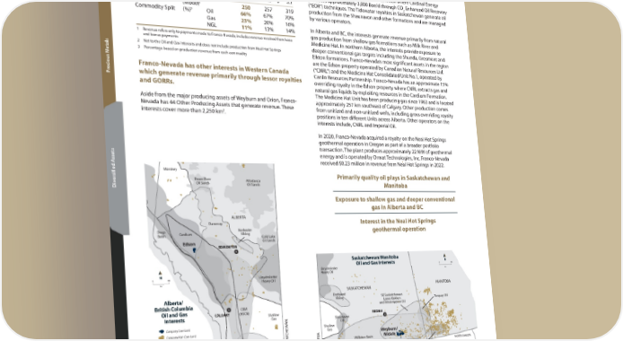 North America Other Producing Energy Assets Location: BC / AB / SK / MB, Canada and Oregon, U.S. In Saskatchewan and Manitoba, the assets are focused primarily in high w Operator: Various quality oil plays and are operated by companies such as Crescent Point vie Royalty: ORR/FH: 0.5-20% Energy, Saturn Oil & Gas Inc., Vermilion Energy Inc. and Tundra Oil & er Gas Partnership. The most significant producing assets are comprised v O of the Midale Unit and the Tidewater royalties. Franco-Nevada holds a 1.14% gross override royalty interest and a 1.59% working interest 2022 2021 2020 in the Midale Unit in Southeast Saskatchewan where Cardinal Energy produces approximately 3,800 Boe/d through CO Enhanced Oil Recovery 1 2 Revenue to Franco-Nevada ($ million) $ 13.4 $ 8.9 $ 5.1 (“EOR”) techniques. The Tidewater royalties in Saskatchewan generate oil 2 production from the Shaunavon and other formations and are managed Production (Mboe) 250 257 319 3 by various operators. Commodity Split (%) Oil 66% 67% 70% Gas 23% 20% 16% In Alberta and BC, the interests generate revenue primarily from natural NGL 11% 13% 14% gas production from shallow gas formations such as Milk River and 1 Revenue refers only to payments made to Franco-Nevada; includes revenue received from lease Medicine Hat. In northern Alberta, the interests provide exposure to and bonus payments deeper conventional gas targets including the Shunda, Grosmont and 2 Net to the Oil and Gas Interests and does not include production from Neal Hot Springs etals 3 Percentage based on production revenue from each commodity Elkton formations. Franco-Nevada’s most significant assets in the region are the Edson property operated by Canadian Natural Resources Ltd. Franco-Nevada has other interests in Western Canada (“CNRL”) and the Medicine Hat Consolidated Unit No.1, operated by ecious M Canlin Resources Partnership. Franco-Nevada has an approximate 15% r which generate revenue primarily through lessor royalties P overriding royalty in the Edson property where CNRL extracts gas and and GORRs. natural gas liquids by exploiting resources in the Cardium Formation. The Medicine Hat Unit has been producing gas since 1963 and is located Aside from the major producing assets of Weyburn and Orion, Franco- approximately 257 km southeast of Calgary. Other production comes Nevada has 44 Other Producing Assets that generate revenue. These from unitized and non-unitized wells, including gross overriding royalty 2 interests cover more than 2,250 km . positions in ten different Units across Alberta. Other operators on the interests include, CNRL and Imperial Oil. In 2020, Franco-Nevada acquired a royalty on the Neal Hot Springs geothermal operation in Oregon as part of a broader portfolio transaction. The plant produces approximately 22 MW of geothermal ssets energy and is operated by Ormat Technologies, Inc. Franco-Nevada received $0.23 million in revenue from Neal Hot Springs in 2022. Montney ersified A Peace River Primarily quality oil plays in Saskatchewan and iv Oil Sands Athabasca D Oil Sands Manitoba Exposure to shallow gas and deeper conventional gas in Alberta and BC ALBERTA Duvernay Interest in the Neal Hot Springs Deep Redwater geothermal operation Basin Cardium Viking Cold Lake Edson Oil Sands EDMONTON Saskatchewan/Manitoba Oil and Gas Interests N Lloydminster 0 80 N Heavy Oil km 0 80 Lloydminster km Heavy Oil SASKATCHEWAN MANITOBA Alberta/ Dodsland SE Saskatchewan British Columbia Viking Lower Bakken Torquay Oil Oil and Gas CBM and Mississippian Oil Interests CALGARY (HSCN) Shallow Gas REGINA AN Shaunavon Company Core Land W Oil Company Non Core Land Shallow CHE A Gas Weyburn/ Major City T T A Midale BRITISH COLUMBIA Williston Basin Alberta SASK ALBER Bakken NORTH DAKOTA Bakken Spearfish Company Core Land WASHINGTON IDAHO MONTANA Sanish Oil Oil Company Non Core Land MONTANA Major City 112 Franco-Nevada Corporation TSX / NYSE: FNV