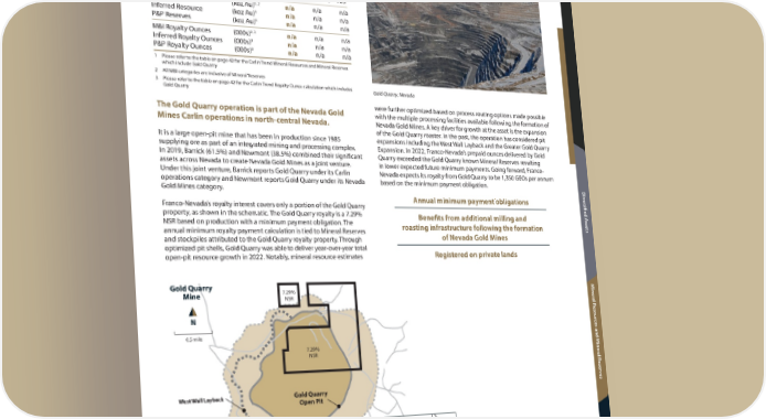 United States Gold Quarry Location: Nevada, United States Operator: Nevada Gold Mines LLC Precious Metals: Au Royalty: NSR: 7.29% 2022 2021 2020 Revenue to Franco-Nevada ($ million) $ 4.9 $ 7.5 $ 10.7 1, 2 M&I Resource (koz Au) n/a n/a n/a Inferred Resource (koz Au)1 n/a n/a n/a P&P Reserves (koz Au)1 n/a n/a n/a 2, 3 M&I Royalty Ounces (000s) n/a n/a n/a 3 Inferred Royalty Ounces (000s) n/a n/a n/a 3 P&P Royalty Ounces (000s) n/a n/a n/a 1 Please refer to the table on page 42 for the Carlin Trend Mineral Resources and Mineral Reserves which include Gold Quarry 2 All M&I categories are inclusive of Mineral Reserves 3 Please refer to the table on page 42 for the Carlin Trend Royalty Ounce calculation which includes Gold Quarry, Nevada Gold Quarry The Gold Quarry operation is part of the Nevada Gold were further optimized based on process routing options made possible with the multiple processing facilities available following the formation of Mines Carlin operations in north-central Nevada. Nevada Gold Mines. A key driver for growth at the asset is the expansion of the Gold Quarry roaster. In the past, the operation has considered pit It is a large open-pit mine that has been in production since 1985 expansions including the West Wall Layback and the Greater Gold Quarry supplying ore as part of an integrated mining and processing complex. Expansion. In 2022, Franco-Nevada’s prepaid ounces delivered by Gold In 2019, Barrick (61.5%) and Newmont (38.5%) combined their significant Quarry exceeded the Gold Quarry known Mineral Reserves resulting assets across Nevada to create Nevada Gold Mines as a joint venture. in lower expected future minimum payments. Going forward, Franco- Under this joint venture, Barrick reports Gold Quarry under its Carlin Nevada expects its royalty from Gold Quarry to be 1,350 GEOs per annum operations category and Newmont reports Gold Quarry under its Nevada based on the minimum payment obligation. D Gold Mines category. iv Annual minimum payment obligations ersified A Franco-Nevada’s royalty interest covers only a portion of the Gold Quarry property, as shown in the schematic. The Gold Quarry royalty is a 7.29% NSR based on production with a minimum payment obligation. The Benefits from additional milling and ssets annual minimum royalty payment calculation is tied to Mineral Reserves roasting infrastructure following the formation and stockpiles attributed to the Gold Quarry royalty property. Through of Nevada Gold Mines optimized pit shells, Gold Quarry was able to deliver year-over-year total Registered on private lands open-pit resource growth in 2022. Notably, mineral resource estimates Gold Quarry 7.29% M Mine NSR iner al R N esour c 0.5 mile es and M 7.29% NSR iner al R eser v West Wall Layback Gold Quarry es Open Pit Oregon Idaho A Gold Quarry Nevada Utah dditional I Potential Greater Gold Quarry Expansion California Arizona Pacific Ocean nf MEXICO orma tion TSX / NYSE: FNV Franco-Nevada Corporation 43