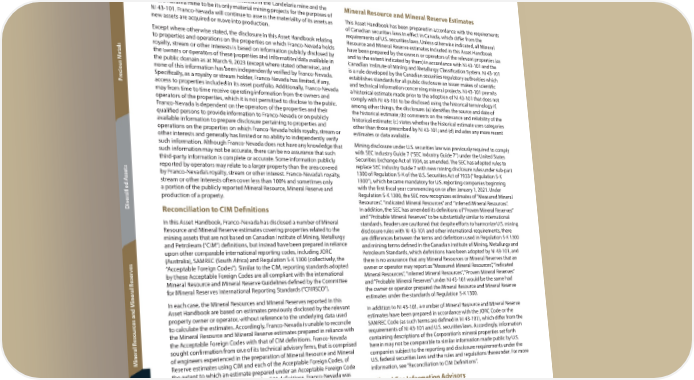 Additional Information Technical and Third-Party Information w vie er Amri Sinuhaji, Vice President, Mining of Franco-Nevada is the qualified person that approved the v O scientific or technical information contained in this Asset Handbook related to mineral projects that are material (for purposes of NI 43-101) to Franco-Nevada. Franco-Nevada considers its stream interests in the Candelaria mine and the Mineral Resource and Mineral Reserve Estimates Cobre Panama mine to be its only material mining projects for the purposes of NI 43-101. Franco-Nevada will continue to assess the materiality of its assets as This Asset Handbook has been prepared in accordance with the requirements new assets are acquired or move into production. of Canadian securities laws in effect in Canada, which differ from the requirements of U.S. securities laws. Unless otherwise indicated, all Mineral Except where otherwise stated, the disclosure in this Asset Handbook relating Resource and Mineral Reserve estimates included in this Asset Handbook to properties and operations on the properties on which Franco-Nevada holds have been prepared by the owners or operators of the relevant properties (as royalty, stream or other interests is based on information publicly disclosed by and to the extent indicated by them) in accordance with NI 43-101 and the etals the owners or operators of these properties and information/data available in Canadian Institute of Mining and Metallurgy Classification System. NI 43-101 the public domain as at March 9, 2023 (except where stated otherwise), and is a rule developed by the Canadian securities regulatory authorities which none of this information has been independently verified by Franco-Nevada. establishes standards for all public disclosure an issuer makes of scientific ecious M Specifically, as a royalty or stream holder, Franco-Nevada has limited, if any, and technical information concerning mineral projects. NI 43-101 permits r access to properties included in its asset portfolio. Additionally, Franco-Nevada a historical estimate made prior to the adoption of NI 43-101 that does not P may from time to time receive operating information from the owners and comply with NI 43-101 to be disclosed using the historical terminology if, operators of the properties, which it is not permitted to disclose to the public. among other things, the disclosure: (a) identifies the source and date of Franco-Nevada is dependent on the operators of the properties and their the historical estimate; (b) comments on the relevance and reliability of the qualified persons to provide information to Franco-Nevada or on publicly historical estimate; (c) states whether the historical estimate uses categories available information to prepare disclosure pertaining to properties and other than those prescribed by NI 43-101; and (d) includes any more recent operations on the properties on which Franco-Nevada holds royalty, stream or estimates or data available. other interests and generally has limited or no ability to independently verify such information. Although Franco-Nevada does not have any knowledge that Mining disclosure under U.S. securities law was previously required to comply such information may not be accurate, there can be no assurance that such with SEC Industry Guide 7 (“SEC Industry Guide 7”) under the United States third-party information is complete or accurate. Some information publicly Securities Exchange Act of 1934, as amended. The SEC has adopted rules to reported by operators may relate to a larger property than the area covered replace SEC Industry Guide 7 with new mining disclosure rules under sub-part ssets by Franco-Nevada’s royalty, stream or other interest. Franco-Nevada’s royalty, 1300 of Regulation S-K of the U.S. Securities Act of 1933 (“Regulation S-K stream or other interests often cover less than 100% and sometimes only 1300”), which became mandatory for U.S. reporting companies beginning a portion of the publicly reported Mineral Resource, Mineral Reserve and with the first fiscal year commencing on or after January 1, 2021. Under ersified A production of a property. Regulation S-K 1300, the SEC now recognizes estimates of “Measured Mineral iv Resources”, “Indicated Mineral Resources” and “Inferred Mineral Resources”. D Reconciliation to CIM Definitions In addition, the SEC has amended its definitions of “Proven Mineral Reserves” and “Probable Mineral Reserves” to be substantially similar to international In this Asset Handbook, Franco-Nevada has disclosed a number of Mineral standards. Readers are cautioned that despite efforts to harmonize U.S. mining Resource and Mineral Reserve estimates covering properties related to the disclosure rules with NI 43-101 and other international requirements, there mining assets that are not based on Canadian Institute of Mining, Metallurgy are differences between the terms and definitions used in Regulation S-K 1300 and Petroleum (“CIM”) definitions, but instead have been prepared in reliance and mining terms defined in the Canadian Institute of Mining, Metallurgy and upon other comparable international reporting codes, including JORC Petroleum Standards, which definitions have been adopted by NI 43-101, and es (Australia), SAMREC (South Africa) and Regulation S-K 1300 (collectively, the there is no assurance that any Mineral Resources or Mineral Reserves that an v “Acceptable Foreign Codes”). Similar to the CIM, reporting standards adopted owner or operator may report as “Measured Mineral Resources”, “Indicated eser by these Acceptable Foreign Codes are all compliant with the international Mineral Resources”, “Inferred Mineral Resources”, “Proven Mineral Reserves” al R Mineral Resource and Mineral Reserve Guidelines defined by the Committee and “Probable Mineral Reserves” under NI 43-101 would be the same had iner for Mineral Reserves International Reporting Standards (“CR