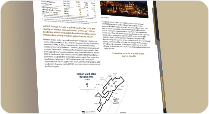Rest of World Edikan Location: Ghana Operator: Perseus Mining Limited Precious Metals: Au Royalty: NSR: 1.5% 2022 2021 2020 Revenue to Franco-Nevada ($ million) $ 4.4 $ 3.9 $ 4.4 M&I Resource (koz Au)1 1,885 2,326 2,573 Inferred Resource (koz Au)1 283 300 344 P&P Reserves (koz Au)1 1,344 1,318 1,477 1, 2 M&I Royalty Ounces (000s) 28 35 39 2 Inferred Royalty Ounces (000s) 4 5 5 2 P&P Royalty Ounces (000s) 20 20 22 Edikan, Ghana 1 Please refer to the tables on pages 116-120 for a breakout of grade and tonnages by Mineral Resource category; all M&I categories are inclusive of Mineral Reserves 2022 production at Edikan was 173,235 ounces of gold compared 2 For Royalty Ounce calculation, Franco-Nevada estimates 100% of the Mineral Resources and Mineral with 150,330 ounces of gold in 2021. In February 2023, Perseus Reserves are subject to our royalty interest and estimates a rate of 1.5% is applicable announced that production in Perseus’ 2023 financial year (July 1, 2022 – In 2011, Franco-Nevada acquired an effective 1.5% NSR June 30, 2023), is expected to be between 193,500 to 206,000 gold royalty on Perseus Mining Limited’s (“Perseus”) Edikan ounces. Exploration opportunities are expected to further extend the gold mine within the Ashanti Gold Belt in Ghana, which current mine life at Edikan with the operator focusing on new exploration targets within trucking distance. In July 2022, Perseus completed a 2 feasibility study on development of the Nkosuo prospect which is includes two mining leases of approximately 93 km . approximately 7 km from the Edikan mill (not covered by Franco-Nevada’s Edikan is a large-scale, low-grade multi open-pit operation that began royalty). Planned trucking of ore and processing of the Nkosuo ore at commercial production in 2012, with ore processed through a centralized the Edikan mill is expected to increase the project mine life to 2027, processing facility. In 2015, a Supplementary Environmental Impact allowing for future near-mine discoveries which could potentially fall on Statement for mining the Fetish, Chirawewa, Bokitsi (collectively referred royalty ground. to as the “Eastern Pits”) and Esuajah North deposits was approved. After D iv a mill upgrade and housing relocation project was completed at the end Exploration potential to further extend ersified A of 2016, the Esuajah South deposit was included in Edikan’s production current mine life profile and an updated life of mine plan was prepared. Gold production was forecast to average 212,000 ounces per annum over Edikan’s ssets estimated mine life of 6.2 years from July 1, 2020 forward, including gold production of approximately 231,000 ounces per annum on average over the first four years. Edikan Gold Mine Esuajah Esuajah North Royalty Area South Abnabna M 1.5% NSR Fobinso iner Mampon al R N Mill Fetish esour 0 10 Site c km Chirawewa es and M Ataasi iner Ayanfuri al R Dadieso Mine eser Licenses v es Mining License and Royalty Area Exploration License Ghana Deposit A Edikan dditional I Gold Mine Accra nf orma tion TSX / NYSE: FNV Franco-Nevada Corporation 79
