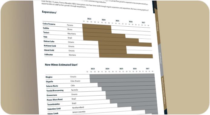13 Franco-Nevada Corporation TSX / NYSE: FNV Overview Mineral Resources and Mineral Reserves Additional Information Diversified Assets Precious Metals 2023 2024 2025 2026 2027 Q1 Q2 Q3 Q4 Q1 Q2 Q3 Q4 Q1 Q2 Q3 Q4 Q1 Q2 Q3 Q4 Q1 Q2 Q3 Q4 Magino Ontario Séguéla Côte d'Ivoire Salares Norte Chile Yandal/Bronzewing Australia Greenstone Ontario Posse (Mara Rosa) Brazil Tocantinzinho Brazil Valentine Gold Newfoundland Eskay Creek British Columbia Stibnite Gold Idaho Copper World Project Arizona 1 2023 Guidance and 2027 Outlook as published on March 15, 2023 in Franco-Nevada’s 2022 Annual Report. Assuming: $1,800/oz Au, $21/oz Ag, $900/oz Pt, $1,500/oz Pd, $120/tonne Fe 62% CFR China, $80/bbl WTI oil and $3.00/mcf Henry Hub natural gas 2 Expansion periods are based on operators’ indicated period of ramp-up 3 Indicated start periods are based on operators’ guidance and FNV best estimates Organic Growth Drivers The ongoing Cobre Panama expansion is expected to be the largest growth driver through the period. That growth is expected to be complemented by a combination of mine expansions and a number of new mines commencing production. Over the last 15 years, Franco-Nevada's GEOs have grown over four times both through organic expansions and acquisitions. We have a strong pipeline of opportunities to add further growth through acquisitions. 2023 2024 2025 2026 2027 Q1 Q2 Q3 Q4 Q1 Q2 Q3 Q4 Q1 Q2 Q3 Q4 Q1 Q2 Q3 Q4 Q1 Q2 Q3 Q4 Cobre Panama Panama Subika Ghana Tasiast Mauritania Vale Brazil Detour Lake Ontario Kirkland Gold Ontario Island Gold Ontario Stillwater Montana Our guidance 1 is for total GEO sales of 640,000 to 700,000 GEOs in 2023 growing to 760,000 to 820,000 GEOs by 2027 through organic growth alone. Expansions 2 New Mines Estimated Start 3
