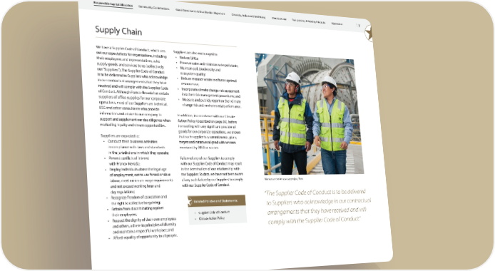 Responsible Capital Allocation Community Contributions Good Governance & Shareholder Alignment Diversity, Inclusion & Well-Being Climate Action Transparency & Guiding Principles Appendices 19 Supply Chain We have a Supplier Code of Conduct, which sets Suppliers are also encouraged to: out our expectations for organizations, including • Reduce GHGs; their employees and representatives, who • Preserve water and minimize water pollutants; supply goods and services to us (collectively, • Maintain soil, biodiversity and our “Suppliers”). The Supplier Code of Conduct ecosystem quality; is to be delivered to Suppliers who acknowledge • Reduce resource waste and foster optimal in our contractual arrangements that they have resource use; received and will comply with the Supplier Code • Incorporate climate change risk assessment of Conduct. Although Franco-Nevada has certain into their risk management procedures; and suppliers of office supplies for our corporate • Measure and publicly report on their climate operations, most of our Suppliers are technical, change risk and environmental performance. ESG and other consultants who provide information and advice to our company to In addition, in accordance with our Climate support and supplement our due diligence when Action Policy (described on page 36), before evaluating royalty and stream opportunities. transacting with any significant provider of goods for our corporate operations, we ensure Suppliers are expected to: that such supplier has commitments, plans, • Conduct their business activities targets and initiatives aligned with net-zero in compliance with laws and standards emissions by 2050 or sooner. in the jurisdictions in which they operate; • Prevent conflicts of interest Failure of any of our Suppliers to comply with Franco-Nevada; with our Supplier Code of Conduct may result • Employ individuals above the legal age in the termination of our relationship with of employment, not to use forced or slave the Supplier. To date, we have not been aware labour, meet minimum wage requirements of any such failure by our Suppliers to comply Workers at the Antapaccay project, Peru and not exceed working hour and with our Supplier Code of Conduct. day regulations; “The Supplier Code of Conduct is to be delivered • Recognize freedom of association and the right to collective bargaining; Related Policies and Statements: to Suppliers who acknowledge in our contractual • Refrain from discriminating against their employees; • Supplier Code of Conduct arrangements that they have received and will • Respect the dignity of their own employees • Climate Action Policy and others, adhere to principles of diversity comply with the Supplier Code of Conduct.” and maintain a respectful workplace; and • Afford equality of opportunity to all people.