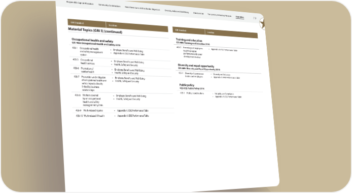 Responsible Capital Allocation Community Contributions Good Governance & Shareholder Alignment Diversity, Inclusion & Well-Being Climate Action Transparency & Guiding Principles Appendices 79 GRI Standard Location GRI Standard Location Material Topics (GRI 3) (continued) Training and education GRI 404: Training and Education 2016 Occupational health and safety 404-3 Percentage of employees • Appendix A: ESG Performance Table GRI 403: Occupational Health and Safety 2018 receiving regular 403-1 Occupational health • Employee Benefits and Well-Being performance and career and safety management • Appendix A: ESG Performance Table development reviews system 403-3 Occupational • Employee Benefits and Well-Being Diversity and equal opportunity health services • Health, Safety and Security GRI 405: Diversity and Equal Opportunity 2016 403-6 Promotion of • Employee Benefits and Well-Being 405-1 Diversity of governance • Diversity and Inclusion worker health • Health, Safety and Security bodies and employees • Appendix A: ESG Performance Table 403-7 Prevention and mitigation • Employee Benefits and Well-Being of occupational health and • Health, Safety and Security Public policy safety impacts directly linked by business GRI 415: Public Policy 2016 relationships 415-1 Political contributions • Integrity and Compliance 403-8 Workers covered • Employee Benefits and Well-Being • Appendix A: ESG Performance Table by an occupational • Health, Safety and Security health and safety management system 403-9 Work-related injuries • Appendix A: ESG Performance Table 403-10 Work-related ill health • Appendix A: ESG Performance Table