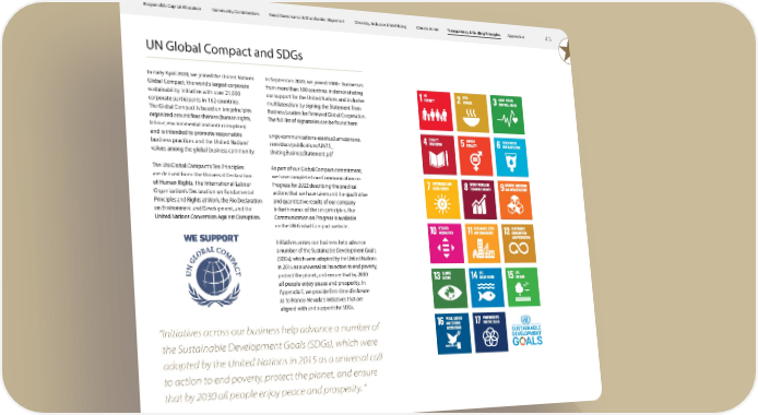 Responsible Capital Allocation Community Contributions Good Governance & Shareholder Alignment Diversity, Inclusion & Well-Being Climate Action Transparency & Guiding Principles Appendices 45 UN Global Compact and SDGs In early April 2020, we joined the United Nations In September 2020, we joined 1000+ businesses Global Compact, the world’s largest corporate from more than 100 countries in demonstrating sustainability initiative with over 21,000 our support for the United Nations and inclusive corporate participants in 162 countries. multilateralism by signing the Statement from The Global Compact is based on ten principles Business Leaders for Renewed Global Cooperation. organized around four themes (human rights, The full list of signatories can be found here: labour, environmental and anti-corruption) and is intended to promote responsible ungc-communications-assets.s3.amazonaws. business practices and the United Nations’ com/docs/publications/UN75_ values among the global business community. UnitingBusinessStatement.pdf The UN Global Compact’s Ten Principles As part of our Global Compact commitment, are derived from: the Universal Declaration we have completed our Communication on of Human Rights, the International Labour Progress for 2022 describing the practical Organization’s Declaration on Fundamental actions that we have taken and the qualitative Principles and Rights at Work, the Rio Declaration and quantitative results of our company on Environment and Development, and the in furtherance of the ten principles. Our United Nations Convention Against Corruption. Communication on Progress is available on the UN Global Compact website. Initiatives across our business help advance a number of the Sustainable Development Goals (SDGs), which were adopted by the United Nations in 2015 as a universal call to action to end poverty, protect the planet, and ensure that by 2030 all people enjoy peace and prosperity. In Appendix F, we provide first-time disclosure as to Franco-Nevada’s initiatives that are aligned with and support the SDGs. “Initiatives across our business help advance a number of the Sustainable Development Goals (SDGs), which were adopted by the United Nations in 2015 as a universal call to action to end poverty, protect the planet, and ensure that by 2030 all people enjoy peace and prosperity. “