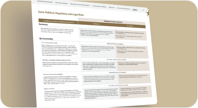 Responsible Capital Allocation Community Contributions Good Governance & Shareholder Alignment Diversity, Inclusion & Well-Being Climate Action Transparency & Guiding Principles Appendices 62 Socio-Political, Regulatory and Legal Risks Potential Financial Impact for: Description of Socio-Political, Regulatory and Legal Risks Our Operators Our Company Summary Policy, regulatory and legal changes in a jurisdiction that seek to promote These regulatory and legal changes may require extensive capital expenditures by • Potential delay (deferral) of Revenues if mandatory adaptation results in delays adaptation to climate change and/or constrain the activities of operators operators to accommodate or conform to such changes, which may lead to projects or cessation of operations and operations that contribute to adverse effects of climate change. being abandoned or placed on care and maintenance if such mandatory • Potential impact to valuation of Assets on balance sheet (e.g. impairment expenditures erode anticipated profitability. or write-off of assets) By Commodity Increased pricing of GHG emissions: Commodities at highest risk: All commodities Regulation of emissions, such as through carbon taxation or cap-and-trade These regulatory and legal changes may require extensive capital expenditures by • Potential delay (deferral) of Revenues if mandatory adaptation results in delays schemes, can significantly increase costs for businesses. As more countries set operators to accommodate or conform to such changes, which may lead to projects or cessation of operations net-zero emissions goals and increasingly ambitious 2030 targets, it is possible being abandoned or placed on care and maintenance if such mandatory • Potential impact to valuation of Assets on balance sheet (e.g. impairment that carbon pricing regulations could become more widely implemented and/or expenditures erode anticipated profitability. or write-off of assets) made more stringent globally. The impact of these regulations will differ depending on the location of the assets and the carbon intensity of production, which varies significantly both within and between commodities. Mandates on and regulation of existing products and services: Commodities at highest risk: Energy (oil, gas, NGLs) If carbon-intensive industries are stigmatised for their contributions to climate Given the contribution of fossil fuels to climate change, regulation and mandates • Potential reduction of Revenues if demand for carbon-intensive commodities change, the use of products and services from these industries could be curbed on the use of these products, including derivatives such as gasoline and plastics, is restricted due to widespread regulation of products by new regulations. may be subject to regulation from policy makers (e.g. ban on gas-powered cars in city centers, increased focus on reducing single-use plastics), which could impact demand for products. Enhanced emissions reporting obligations: Commodities at highest risk: All commodities As governments seek to improve emissions data and meet their respective Companies may face growing pressure to report their emissions in compliance • Potential increase to Operating Expenditures with growing demand to collect long-term emissions goals, there may be increased obligations to report on with mandatory disclosure regimes, which will increase costs. Such companies data, produce emissions reports, obtain external assurance, etc. energy usage and emissions and/or to obtain independent external assurance could also encounter financial losses as a result of fines if they are unwilling for such data. Companies may be required to comply with detailed mandatory or unable to comply with new regulations. TCFD or other reporting legislation as a result. Exposure to litigation: Commodities at highest risk: Energy (oil, gas, NGLs) The expansion of climate-related legislation creates litigation risks for those Legal actions against Energy producers could increase operating costs (e.g. through • Corresponding direct impact to Revenues upon reduction of demand for companies that are unable to keep up with the pace of developments. Companies payment of legal fees, fines, settlements, or insurance fees), reduce demand for commodities due to reputational damage to entire sectors or industries in heavy industries, such as mining and oil and gas, could also face legal action products, and cause reputational damage. Energy producers in North America and • Potential impact to valuation of Assets on balance sheet (e.g. impairment due to their relatively higher levels of emissions/emissions intensities, with some Europe have already faced legal challenges on various grounds, with accusations or write-off of assets) if increased operating costs cause uneconomic assets claimants also seeking to link climate change to other sustainability concerns, ranging from misleading investors to infringing on the rights of nature and the right to become stranded such as human rights. of life of future generations.