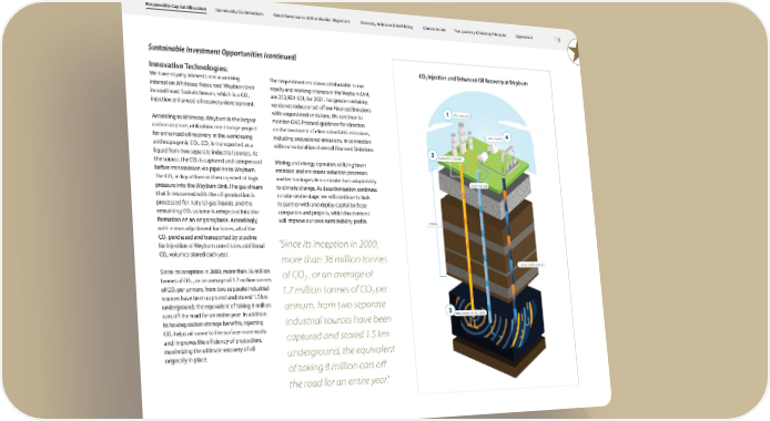 Responsible Capital Allocation Community Contributions Good Governance & Shareholder Alignment Diversity, Inclusion & Well-Being Climate Action Transparency & Guiding Principles Appendices 18 Sustainable Investment Opportunities (continued) CO Injection and Enhanced Oil Recovery at Weyburn Innovative Technologies: 2 We have royalty interests and a working The sequestered emissions attributable to our interest on Whitecap Resources’ Weyburn Unit royalty and working interests in the Weyburn Unit, in southeast Saskatchewan, which is a CO are 252,924 tCO for 2021. For greater certainty, 2 2 injection enhanced oil recovery development. we do not reduce or set-off our Financed Emissions with sequestered emissions. We continue to According to Whitecap, Weyburn is the largest monitor GHG Protocol guidance for direction carbon capture, utilization and storage project on the treatment of eliminated GHG emissions, for enhanced oil recovery in the world using including sequestered emissions, in connection anthropogenic CO2. CO2 is transported as a with our calculation of overall Financed Emissions. liquid from two separate industrial sources. At the source, the CO is captured and compressed Mining and energy operators utilizing lower 2 before transmission via pipeline to Weyburn. emission and emissions reduction processes The CO in liquid form is then injected at high and technologies demonstrate their adaptability 2 pressure into the Weyburn Unit. The gas stream to climate change. As decarbonisation continues that is recovered with the oil production is to take centre stage, we will continue to look processed for natural gas liquids and the to partner with and deploy capital to these remaining CO volume is reinjected into the companies and projects, which involvement 2 formation on an ongoing basis. Accordingly, will improve our own sustainability profile. with minor adjustment for losses, all of the CO purchased and transported by pipeline 2 “Since its inception in 2000, for injection at Weyburn constitutes additional CO volumes stored each year. 2 more than 36 million tonnes Since its inception in 2000, more than 36 million of CO , or an average of tonnes of CO , or an average of 1.7 million tonnes 2 2 of CO per annum, from two separate industrial 2 1.7 million tonnes of CO per sources have been captured and stored 1.5 km 2 underground, the equivalent of taking 8 million annum, from two separate cars off the road for an entire year. In addition to having carbon storage benefits, injecting industrial sources have been CO helps oil come to the surface more easily 2 captured and stored 1.5 km and improves the efficiency of production, maximizing the ultimate recovery of oil underground, the equivalent originally in place. of taking 8 million cars off the road for an entire year.”