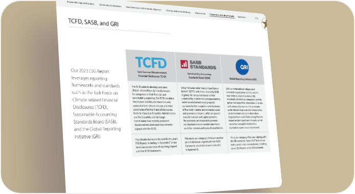 Responsible Capital Allocation Community Contributions Good Governance & Shareholder Alignment Diversity, Inclusion & Well-Being Climate Action Transparency & Guiding Principles Appendices 44 TCFD, SASB, and GRI Our 2023 ESG Report Task Force on Climate-related Sustainability Accounting Financial Disclosures (TCFD) Standards Board (SASB) Global Reporting Initiative (GRI) leverages reporting frameworks and standards The TCFD seeks to develop consistent Using the Sustainable Industry Classification GRI is an international independent such as the Task Force on climate-related financial risk disclosures System® (SICS®), which was created by SASB standards organization with the world’s for companies in their financial and to group like companies based on their most widely adopted sustainability Climate-related Financial sustainability reporting. The TCFD considers sustainability-related risks and opportunities, standards, which helps companies identify, the physical, liability and transition risks SASB has established industry-specific gather and report this information in a clear Disclosures (TCFD), associated with climate change and what standards for the recognition and disclosure and comparable manner. The standards constitutes effective financial disclosures. of financially material environmental, social cover relevant topics across the economic, Sustainable Accounting Both the Canadian Securities Administrators and governance impacts, which are geared environmental and social dimensions. and the Securities and Exchange towards investors and capital providers. Organizations select from among these to Standards Board (SASB), Commission have recently proposed The standards are designed to generate report on their significant impacts, which climate-related disclosure requirements standardized and comparable data that is can either be implemented into a and the Global Reporting aligned with the TCFD. useful for investors and typically quantitative. standalone report or can be indexed. Initiative (GRI). The climate disclosure included in this year’s This marks our company’s third consecutive This is our company’s first year aligning with ESG Report, including in Appendix C, is our year of disclosure aligned with the SASB the GRI standards. Appendix E includes an third consecutive year of reporting aligned framework, which disclosure is included index, which maps our disclosure, including with the TCFD framework. in Appendix D. in our ESG Report, to the GRI standards.