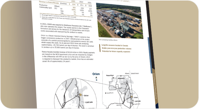 O R I O N Location: Alberta, Canada | Operator: Strathcona Resources Ltd. | Energy: Oil | Royalty: Royalty Rate 4% Franco-Nevada acquired a 4% GORR on the Orion Thermal Project in the Cold Lake region of Alberta from OSUM Oil Sands Corp. for C$92.5 million in 2017. 2023 2022 2021 Revenue to Franco-Nevada ($ million) $ 13.6 $ 15.1 $ 10.8 Production (Mboe) 302 229 237 Commodity Split (%) 1 Oil 100% 100% 100% Gas 0% 0% 0% NGL 0% 0% 0% 1 Percentage based on production revenue from each commodity 2 Asset life is calculated as the Proven and Probable reserve volumes divided by the prior year production volume In 2021, OSUM was acquired by Strathcona Resources Ltd. (“Strathcona”), who now operates the project. The royalty applies to the Clearwater formation and allows for the deduction of transportation and diluent costs associated with transporting the product to market. Orion is a Steam Assisted Gravity Drainage (“SAGD”) operation that began commercial production in 2007. Infrastructure at the project consists of a central processing facility surrounded by several well pads which supply the plant. As at year-end 2023 Orion was producing approximately ~20,700 barrels per day of bitumen. The asset is permitted to produce up to 25,000 barrels per day of bitumen. Franco-Nevada recorded revenue of $13.6 million in 2023. Royalty payments are based on the WCS benchmark price and are impacted by changes in the differential with WTI as well as by the price of diluent, which is required to transport the product to market. Orion has an estimated asset life of approximately 24 years 2. Long-life resource located in Canada Stable year-over-year production volumes Potential for future capacity expansion Orion processing facilities, Alberta Grand Prairie Calgary Lloydminster Hardisty Edmonton Fort McMurray Cold Lake Peace River Alberta Saskatchewan Orion Athabaska Lloydminster Hardisty Edmonton Cold Lake Orion N Orion Alberta Saskatchewan Liquids Pipeline Franco-Nevada Corporation ★ 113 TSX / NYSE: FNV North America