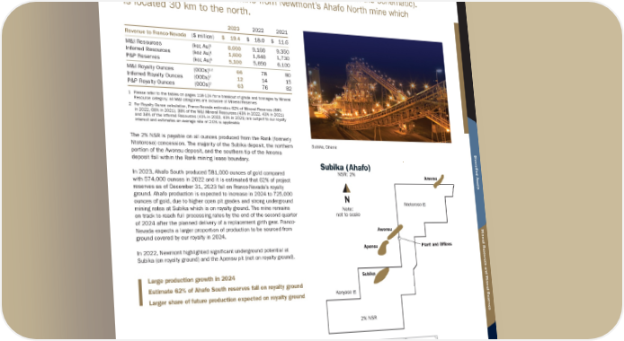 S U B I K A ( A H A F O ) Location: Ghana | Operator: Newmont Corporation | Precious Metals: Au | Royalty: NSR: 2% Franco-Nevada has a 2% NSR royalty which covers a 78 km 2 area on the southern portion of Newmont’s Ahafo South mine in Ghana (shown in the schematic). Ahafo South is a separate mine from Newmont’s Ahafo North mine which is located 30 km to the north. 2023 2022 2021 Revenue to Franco-Nevada ($ million) $ 19.4 $ 18.0 $ 11.6 M&I Resources (koz Au) 1 8,600 9,160 9,350 Inferred Resources (koz Au) 1 1,600 1,640 1,730 P&P Reserves (koz Au) 1 5,100 5,650 6,100 M&I Royalty Ounces (000s) 1,2 66 78 80 Inferred Royalty Ounces (000s) 2 12 14 15 P&P Royalty Ounces (000s) 2 63 76 82 1 Please refer to the tables on pages 118-124 for a breakout of grade and tonnages by Mineral Resource category; all M&I categories are inclusive of Mineral Reserves 2 For Royalty Ounce calculation, Franco-Nevada estimates 62% of Mineral Reserves (68% in 2022, 68% in 2021), 38% of the M&I Mineral Resources (43% in 2022, 43% in 2021) and 38% of the Inferred Resources (43% in 2022, 43% in 2021) are subject to our royalty interest and estimates an average rate of 2.0% is applicable The 2% NSR is payable on all ounces produced from the Rank (formerly Ntotoroso) concession. The majority of the Subika deposit, the northern portion of the Awonsu deposit, and the southern tip of the Amoma deposit fall within the Rank mining lease boundary. In 2023, Ahafo South produced 581,000 ounces of gold compared with 574,000 ounces in 2022 and it is estimated that 62% of project reserves as of December 31, 2023 fall on Franco-Nevada’s royalty ground. Ahafo production is expected to increase in 2024 to 725,000 ounces of gold, due to higher open pit grades and strong underground mining rates at Subika which is on royalty ground. The mine remains on track to reach full processing rates by the end of the second quarter of 2024 after the planned delivery of a replacement girth gear. Franco- Nevada expects a larger proportion of production to be sourced from ground covered by our royalty in 2024. In 2022, Newmont highlighted significant underground potential at Subika (on royalty ground) and the Apensu pit (not on royalty ground). Large production growth in 2024 Estimate 62% of Ahafo South reserves fall on royalty ground Larger share of future production expected on royalty ground Subika, Ghana Subika (Ahafo) NSR: 2% N Note: not to scale Mina Justa Atlantic Ocean Burkina Faso Cote D’ivoire Togo Benin Nigeria Niger Mali Algeria Subika Ghana 2% NSR Awonsu Apensu Subika Plant and Offices Ntotoroso Amoma Kenyase FNV Royalties Deposits Franco-Nevada Corporation ★ 77 TSX / NYSE: FNV Rest of World