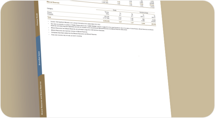 C O B R E P A N A M A E X C L U S I O N Mineral Resources - Inclusive of Mineral Reserves Grade Contained Metal Category Tonnes 000s Au g/t Ag g/t Au 000 oz Ag 000 oz Measured 129,100 0.14 1.63 581 6,766 Indicated 3,255,300 0.06 1.33 6,322 138,695 M&I 3,384,400 0.06 1.34 6,903 145,460 Inferred 1,087,300 0.04 1.09 1,291 37,903 Mineral Reserves Grade Contained Metal Category Tonnes 000s Au g/t Ag g/t Au 000 oz Ag 000 oz Proven 126,100 0.14 1.59 568 6,446 Probable 2,717,500 0.07 1.36 6,080 119,042 Total 2,843,600 0.07 1.37 6,648 125,499 • Source: First Quantum Minerals Ltd.'s Annual Information Form dated March 28, 2023 • The mine is currently in a phase of P&SM. Please refer to the “COBRE PANAMA” section on page 39 of this Asset Handbook. Due to the status of Cobre Panama, Mineral Resources and Mineral Reserves are being reported separately and are not included in the comprehensive Mineral Resources and Mineral Reserves tables above • Mineral Resources and Mineral Reserves are estimated using 2014 CIM Definition Standards • Mineral Resources are reported inclusive of Mineral Reserves • Stockpiles have been added into the Mineral Resources and Mineral Reserves • Rows and columns may not add up due to rounding TSX / NYSE: FNV 122 ★ Franco-Nevada Corporation Mineral Resources and Mineral Reserves