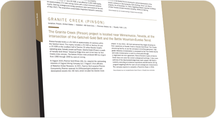 S T E R L I N G Location: Nevada, United States | Operator: AngloGold Ashanti | Precious Metals: Au | Royalty: NSR: 0.25% Sterling is a historic gold operation located 185 km northwest of Las Vegas, Nevada near Beatty, Nevada. In 2022, AngloGold Ashanti acquired 100% of Coeur’s wholly owned subsidiary, Coeur Sterling, Inc., which owned the Sterling property. Franco-Nevada holds 1 / 8 th of a 2% NSR, or an effective 0.25% NSR royalty, on approximately 272 lode mining claims with a small minimum advance royalty. Sterling underground mining operations were terminated at the end of May 2015. The acquisition consolidates AngloGold Ashanti’s ownership position in the Beatty District allowing for optimal development of the assets centered on developing the North Bullfrog, Silicon and Merlin projects. As of December 31, 2023, AngloGold Ashanti reported 16.6Mozs of total Nevada mineral resource including .91Moz at Sterling. Franco-Nevada has not included Sterling in Royalty Ounce estimates G R A N I T E C R E E K ( P I N S O N ) Location: Pinson, United States | Operator: i-80 Gold Corp. | Precious Metals: Au | Royalty: NSR: 1-2% The Granite Creek (Pinson) project is located near Winnemucca, Nevada, at the intersection of the Getchell Gold Belt and the Battle Mountain-Eureka Trend. Franco-Nevada holds a 1-2% NSR on approximately 20 sections within the Getchell trend. This royalty includes a 2% NSR on Section 33 and a 1% NSR on the southern half of Section 32 within Granite Creek’s operating area, formally known as Pinson. Granite Creek (Pinson) is south of Nevada Gold Mines’ Turquoise Ridge mine and 13 km from its Twin Creeks mine complex. The historic Pinson mine produced 985 koz of gold from 1980 through 1999 by open-pit mining. In August 2020, Premier Gold Mines USA, Inc. acquired the outstanding interests of Osgood Mining Company LLC (“Osgood”) from affiliates of Waterton Global Resource. In 2021, Equinox Gold acquired Premier. Concurrently, Premier spun-out its US-focused gold production and development assets into i-80 Gold, which included the Granite Creek project. In July 2022, i-80 Gold announced they began shipping ore from operations at Granite Creek to Nevada Gold Mines’ Twin Creeks processing facility, as per the company’s toll-milling agreement. High- grade refractory mineralization is processed at the Twin Creeks facility and oxide mineralization is sold to a third-party through a negotiated ore sale agreement. Franco-Nevada’s royalty at Granite Creek does not cover the current underground workings, it does cover portions of the development-stage heap leach project. I-80 Gold is currently executing an extensive exploration and delineation drilling program targeting both the open pit and underground mineralization. The company expects to complete a Feasibility Study in 2024. Franco-Nevada has not included Granite Creek (Pinson) in Royalty Ounce estimates TSX / NYSE: FNV 52 ★ Franco-Nevada Corporation United States