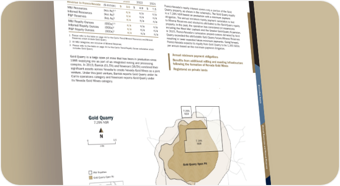 G O L D Q U A R R Y Location: Nevada, United States | Operator: Nevada Gold Mines LLC | Precious Metals: Au | Royalty: NSR: 7.29% The Gold Quarry operation is part of the Nevada Gold Mines Carlin operations in north-central Nevada. 2023 2022 2021 Revenue to Franco-Nevada ($ million) $ 3.0 $ 4.9 $ 7.5 M&I Resources (koz Au) 1,2 n/a n/a n/a Inferred Resources (koz Au) 1 n/a n/a n/a P&P Reserves (koz Au) 1 n/a n/a n/a M&I Royalty Ounces (000s) 2,3 n/a n/a n/a Inferred Royalty Ounces (000s) 3 n/a n/a n/a P&P Royalty Ounces (000s) 3 n/a n/a n/a 1 Please refer to the table on page 44 for the Carlin Trend Mineral Resources and Mineral Reserves which include Gold Quarry 2 All M&I categories are inclusive of Mineral Reserves 3 Please refer to the table on page 44 for the Carlin Trend Royalty Ounce calculation which includes Gold Quarry Gold Quarry is a large open pit mine that has been in production since 1985 supplying ore as part of an integrated mining and processing complex. In 2019, Barrick (61.5%) and Newmont (38.5%) combined their significant assets across Nevada to create Nevada Gold Mines as a joint venture. Under this joint venture, Barrick reports Gold Quarry under its Carlin operations category and Newmont reports Gold Quarry under its Nevada Gold Mines category. Franco-Nevada’s royalty interest covers only a portion of the Gold Quarry property, as shown in the schematic. The Gold Quarry royalty is a 7.29% NSR based on production with a minimum payment obligation. The annual minimum royalty payment calculation is tied to Mineral Reserves and stockpiles attributed to the Gold Quarry royalty property. In the past, the operation has considered pit expansions including the West Wall Layback and the Greater Gold Quarry Expansion. In 2023, Franco-Nevada’s cumulative prepaid ounces delivered by Gold Quarry exceeded the attributable Gold Quarry known Mineral Reserves resulting in lower expected future minimum payments. Going forward, Franco-Nevada expects its royalty from Gold Quarry to be 1,350 GEOs per annum based on the minimum payment obligation. Gold Quarry Open Pit FNV Royalties Potential Greater Gold Quarry Expansion West Wall Layback 7.29% NSR 7.29% NSR Gold Quarry Open Pit Gold Quarry Pacific Ocean Oregon Idaho Utah Nevada California Arizona MEXICO mile 0.5 0 Gold Quarry 7.29% NSR N Annual minimum payment obligations Benefits from additional milling and roasting infrastructure following the formation of Nevada Gold Mines Registered on private lands Franco-Nevada Corporation ★ 45 TSX / NYSE: FNV South America
