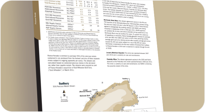 S U D B U R Y Location: Ontario, Canada | Operator: KGHM International Ltd. | Precious Metals: PGM & Au | Stream: 50% Precious Metal Stream Franco-Nevada has three precious metals streams in the Sudbury basin of Ontario. 2023 2022 2021 PGM Revenue to FNV ($ million) $ 13.4 $ 18.3 $ 14.6 Gold Revenue to FNV ($ million) $ 4.2 $ 3.1 $ 2.8 Total Revenue to FNV ($ million) $ 17.6 $ 21.4 $ 17.4 PGM M&I Resources (koz PGM) 1 n/a n/a n/a PGM Inferred Resources (koz PGM) 1 n/a n/a n/a PGM P&P Resources (koz PGM) 1 n/a n/a n/a Gold M&I Resources (koz Au) 1 n/a n/a n/a Gold Inferred Resources (koz Au) 1 n/a n/a n/a Gold P&P Resources (koz Au) 1 n/a n/a n/a M&I Royalty Ounces (000s) 1,3 24 24 24 Inferred Royalty Ounces (000s) 1 - - - P&P Royalty Ounces (000s) 1 24 24 24 1 KGHM does not provide public estimates for Mineral Resources and Mineral Reserves. Previous estimates have not been updated in numerous years and thus Franco-Nevada has chosen not to continue to report these figures 2 For Royalty Ounce calculation, Franco-Nevada estimates 5 years of mining (5 years in 2022, 5 years in 2021) from McCreedy West are subject to our 50% stream interest to which a 40% margin factor (40% in 2022, 40% in 2021) has been applied based on assumed ongoing payments of 60% of the spot price. Platinum and palladium have been converted to Royalty Ounces assuming $1,950/ounce Au, $800/ounce Pt and $900/ounce Pd ($1,800/ounce Au, $900/ounce Pt and $1,500/ounce Pd in 2022, $1,800/ounce Au, $1,000/ounce Pt and $2,100/ounce Pd in 2021). Note that this stream interest is calculated based on contained ounces in ore as there are no losses associated to metallurgical recoveries in the calculation of the Royalty Ounce Franco-Nevada is entitled to purchase 50% of the precious metals contained in ore produced from the footwall portions of three separate mines subject to ongoing payments per ounce. The streams are calculated based on contained precious metals in the delivered ore rather than payable metals. The streams were acquired as part of Franco-Nevada’s acquisition of Gold Wheaton Gold Corp. (“Gold Wheaton”) in March 2011. At the time of acquisition by Franco-Nevada, the mines were operated by Quadra FNX Mining Ltd. (“Quadra FNX”) which was subsequently acquired by KGHM International Ltd. (“KGHM”) in March 2012. The three mines are the Levack (Morrison Deposit), Podolsky and McCreedy West mines. The footwall deposits are primarily rich in palladium followed by platinum and gold. KGHM does not have processing facilities in Sudbury and sells the ore to third parties for processing. Currently all ore is being processed by Vale’s Clarabelle plant in Sudbury. McCreedy West Mine: The stream agreement applies to the PM and 700 deposits at the McCreedy West mine. McCreedy West stopped mining the precious metal-rich ores in the PM deposit in 2011. Franco-Nevada agreed to renegotiate the existing contract with KGHM, and mining restarted in September 2018. In February 2021, KGHM approved an updated life of mine plan which extended mining operations at the McCreedy West mine for another five years. To support this extension of operations in mid-2021, Franco-Nevada agreed to increase its purchase price per GEO, from $800 per ounce to 60% of the prevailing monthly average gold spot price during periods when monthly average gold prices exceed $1,333 per ounce subject to a cap of $1,200 per ounce. McCreedy is expected to be the main source of revenue from Sudbury to Franco-Nevada in 2024 and is expected to operate through the end of 2028. Levack (Morrison Deposit): This mine was operated between 2007 and 2019 and is currently on care and maintenance. Podolsky Mine: The stream agreement applies to the 2000 and North deposits at the Podolsky mine which operated between 2008 and 2013. The mine is currently on care and maintenance, but KGHM is reviewing the possible restart of the mine. Quebec Ontario Sudbury kilometer 5 0 N Sudbury 50% Precious Metals Stream Podolsky Levack (Morrison Deposit) McCreedy West Strathcona Mill Creighton Nickel Rim South Totten Coleman Copper Cliff Smelter Clarabelle Mill Sudbury Sudbury Igneous Complex Chelmsford Formation Onaping & Onwatin Formations Current and Former Mines Mill Smelter Stream Properties TSX / NYSE: FNV 56 ★ Franco-Nevada Corporation Canada