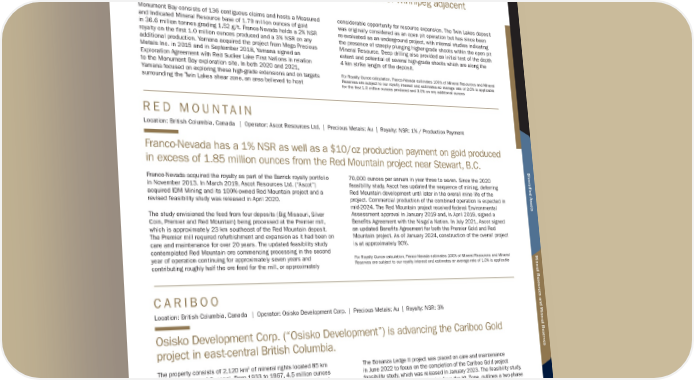 M O N U M E N T B A Y Location: Manitoba, Canada | Operator: Agnico Eagle Mines Limited | Precious Metals: Au | Royalty: NSR: 2-3% In January 2023, Agnico Eagle acquired the Monument Bay project as part the acquisition of Yamana’s Canadian assets. The Monument Bay project, is located in Manitoba, approximately 570 km northeast of Winnipeg adjacent to the Ontario border. Monument Bay consists of 136 contiguous claims and hosts a Measured and Indicated Mineral Resource base of 1.79 million ounces of gold in 36.6 million tonnes grading 1.52 g/t. Franco-Nevada holds a 2% NSR royalty on the first 1.0 million ounces produced and a 3% NSR on any additional production. Yamana acquired the project from Mega Precious Metals Inc. in 2015 and in September 2018, Yamana signed an Exploration Agreement with Red Sucker Lake First Nations in relation to the Monument Bay exploration site. In both 2020 and 2021, Yamana focused on exploring these high-grade extensions and on targets surrounding the Twin Lakes shear zone, an area believed to host considerable opportunity for resource expansion. The Twin Lakes deposit was originally considered as an open pit operation but has since been re-evaluated as an underground project, with internal studies indicating the presence of steeply plunging higher-grade shoots within the open pit Mineral Resource. Deep drilling also provided an initial test of the depth extent and potential of several high-grade shoots which are along the 4 km strike length of the deposit. For Royalty Ounce calculation, Franco-Nevada estimates 100% of Mineral Resources and Mineral Reserves are subject to our royalty interest and estimates an average rate of 2.0% is applicable for the first 1.0 million ounces produced and 3.0% on any additional ounces C A R I B O O Location: British Columbia, Canada | Operator: Osisko Development Corp. | Precious Metals: Au | Royalty: NSR: 3% Osisko Development Corp. (“Osisko Development”) is advancing the Cariboo Gold project in east-central British Columbia. The property consists of 2,120 km 2 of mineral rights located 85 km east of the town of Quesnel. From 1933 to 1967, 4.5 million ounces of gold were mined in the area from both historical underground and alluvial production. Osisko Development started mining the Bonanza Ledge II project, located within the Cariboo Gold project, in Q1 2021. The Bonanza Ledge II Mineral Resource includes the BC Vein, Bonanza Ledge, and KL Zone deposits. Franco-Nevada’s 3% NSR covers the claims to the immediate northeast of Bonanza Ledge, referred to as the KL Zone. Franco-Nevada’s 3% royalty interest also includes the Williams Claims which are about 5 km southeast of Bonanza Ledge. The Bonanza Ledge II project was placed on care and maintenance in June 2022 to focus on the completion of the Cariboo Gold project feasibility study, which was released in January 2023. The feasibility study, which does not envision production from the KL Zone, outlines a two-phase ramp up, with first production in 2025. Phase 1 is 1,500 tpd at approximately 73,000 ounces per year for the first three years and Phase 2 is 4,900 tpd with underground development and production to increase to approximately 194,000 ounces per year starting in 2028. The broader project has an initial 12-year mine life and there is potential to convert additional Inferred Resources located adjacent to reserve blocks, with mineralization open at depth and along strike. Franco-Nevada has not included Cariboo in Royalty Ounce estimates R E D M O U N T A I N Location: British Columbia, Canada | Operator: Ascot Resources Ltd. | Precious Metals: Au | Royalty: NSR: 1% / Production Payment Franco-Nevada has a 1% NSR as well as a $10/oz production payment on gold produced in excess of 1.85 million ounces from the Red Mountain project near Stewart, B.C. Franco-Nevada acquired the royalty as part of the Barrick royalty portfolio in November 2013. In March 2019, Ascot Resources Ltd. (“Ascot”) acquired IDM Mining and its 100%-owned Red Mountain project and a revised feasibility study was released in April 2020. The study envisioned the feed from four deposits (Big Missouri, Silver Coin, Premier and Red Mountain) being processed at the Premier mill, which is approximately 23 km southeast of the Red Mountain deposit. The Premier mill required refurbishment and expansion as it had been on care and maintenance for over 20 years. The updated feasibility study contemplated Red Mountain ore commencing processing in the second year of operation continuing for approximately seven years and contributing roughly half the ore feed for the mill, or approximately 70,000 ounces per annum in year three to seven. Since the 2020 feasibility study, Ascot has updated the sequence of mining, deferring Red Mountain development until later in the overall mine life of the project. Commercial production of the combined operation is expected in mid-2024. The Red Mountain project received federal Environmental Assessment approval in January 2019 and, in April 2019, signed a Benefits Agreement with the Nisga’a Nation. In July 2021, Ascot signed an updated Benefits Agreement for both the Premier Gold and Red Mountain project. As of January 2024, construction of the overall project is at approximately 90%. For Royalty Ounce calculation, Franco-Nevada estimates 100% of Mineral Resources and Mineral Reserves are subject to our royalty interest and estimates an average rate of 1.0% is applicable Franco-Nevada Corporation ★ 71 TSX / NYSE: FNV Canada