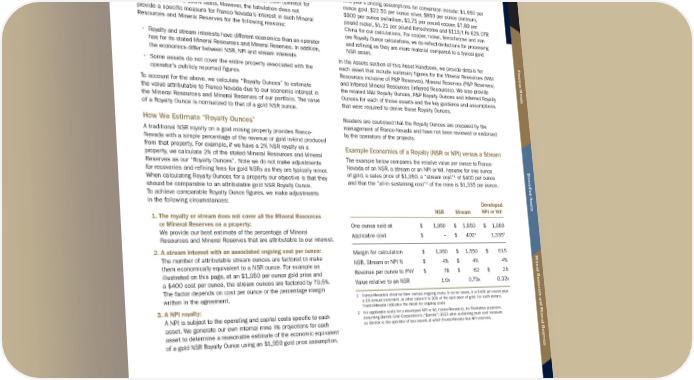 R O Y A L T Y O U N C E S Why We Measure “Royalty Ounces” Franco-Nevada’s mining properties that have reported Mineral Resources and Mineral Reserves are tabulated in the Mineral Resources and Mineral Reserves appendix of this Asset Handbook. Unless otherwise noted in the Royalty Ounce calculation for each asset, the figures are tabulated based on the publicly disclosed reports of each operator for each property on a 100% basis. However, the tabulation does not provide a specific measure for Franco-Nevada’s interest in such Mineral Resources and Mineral Reserves for the following reasons: • Royalty and stream interests have different economics than an operator has for its stated Mineral Resources and Mineral Reserves. In addition, the economics differ between NSR, NPI and stream interests • Some assets do not cover the entire property associated with the operator’s publicly reported figures To account for the above, we calculate “Royalty Ounces” to estimate the value attributable to Franco-Nevada due to our economic interest in the Mineral Resources and Mineral Reserves of our portfolio. The value of a Royalty Ounce is normalized to that of a gold NSR ounce. How We Estimate “Royalty Ounces” A traditional NSR royalty on a gold mining property provides Franco- Nevada with a simple percentage of the revenue or gold in-kind produced from that property. For example, if we have a 2% NSR royalty on a property, we calculate 2% of the stated Mineral Resources and Mineral Reserves as our “Royalty Ounces”. Note we do not make adjustments for recoveries and refining fees for gold NSRs as they are typically minor. When calculating Royalty Ounces for a property our objective is that they should be comparable to an attributable gold NSR Royalty Ounce. To achieve comparable Royalty Ounce figures, we make adjustments in the following circumstances: 1. The royalty or stream does not cover all the Mineral Resources or Mineral Reserves on a property: We provide our best estimate of the percentage of Mineral Resources and Mineral Reserves that are attributable to our interest. 2. A stream interest with an associated ongoing cost per ounce: The number of attributable stream ounces are factored to make them economically equivalent to a NSR ounce. For example as illustrated on this page, at an $1,950 per ounce gold price and a $400 cost per ounce, the stream ounces are factored by 79.5%. The factor depends on cost per ounce or the percentage margin written in the agreement. 3. A NPI royalty: A NPI is subject to the operating and capital costs specific to each asset. We generate our own internal mine life projections for each asset to determine a reasonable estimate of the economic equivalent of a gold NSR Royalty Ounce using an $1,950 gold price assumption. 4. An asset producing silver, PGM or base/bulk metal: The number of attributable silver, platinum or palladium ounces, and attributable base/bulk metals pounds/tonnes are converted into Royalty Ounces. This year’s pricing assumptions for conversion include: $1,950 per ounce gold, $22.50 per ounce silver, $850 per ounce platinum, $900 per ounce palladium, $3.75 per pound copper, $7.89 per pound nickel, $1.21 per pound ferrochrome and $115/t Fe 62% CFR China for our calculations. For copper, nickel, ferrochrome and iron ore Royalty Ounce calculations, we do reflect deductions for processing and refining as they are more material compared to a typical gold NSR asset. In the Assets section of this Asset Handbook, we provide details for each asset that include summary figures for the Mineral Resources (M&I Resources inclusive of P&P Reserves), Mineral Reserves (P&P Reserves) and Inferred Mineral Resources (Inferred Resources). We also provide the related M&I Royalty Ounces, P&P Royalty Ounces and Inferred Royalty Ounces for each of those assets and the key guidance and assumptions that were required to derive those Royalty Ounces. Readers are cautioned that the Royalty Ounces are prepared by the management of Franco-Nevada and have not been reviewed or endorsed by the operators of the projects. Example Economics of a Royalty (NSR or NPI) versus a Stream The example below compares the relative value per ounce to Franco- Nevada of an NSR, a stream or an NPI or WI. Assume for one ounce of gold, a sales price of $1,950, a “stream cost” 1 of $400 per ounce and that the “all-in sustaining cost” 2 of the mine is $1,335 per ounce. NSR Stream Developed NPI or WI 1 One ounce sold at $ 1,950 $ 1,950 $ 1,950 Applicable cost $ – $ 400 1 1,335 2 Margin for calculation $ 1,950 $ 1,550 $ 615 NSR, Stream or NPI % $ 4% $ 4% 4% Revenue per ounce to FNV $ 78 $ 62 $ 25 Value relative to an NSR 1.0x 0.79x 0.32x 1 Franco-Nevada’s streams have various ongoing costs. In some cases, it is $400 per ounce plus a 1% annual increment, in other cases it is 20% of the spot price of gold. For each stream, Franco-Nevada indicates the detail for ongoing costs 2 For applicable costs for a developed NPI or WI, Franco-Nevada is, for illustrative purposes, assuming Barrick Gold Corporation’s (“Barrick”) 2023 all-in sustaining cash cost measure, as Barrick is the operator of two assets at which Franco-Nevada has NPI interests Franco-Nevada Corporation ★ 19 TSX / NYSE: FNV Overview