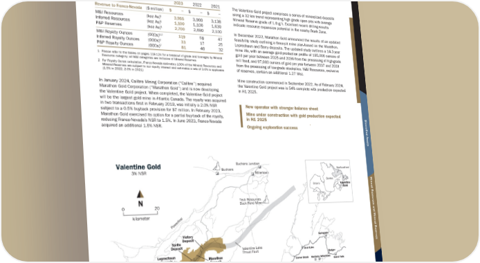 V A L E N T I N E G O L D Location: Newfoundland, Canada | Operator: Calibre Mining Corporation | Precious Metals: Au | Royalty: NSR: 3% Franco-Nevada holds a 3% NSR on the Valentine Lake Gold Camp in central Newfoundland. 2023 2022 2021 Revenue to Franco-Nevada ($ million) $ − $ – $ – M&I Resources (koz Au) 1 3,955 3,960 3,138 Inferred Resources (koz Au) 1 1,100 1,100 1,639 P&P Reserves (koz Au) 1 2,700 2,690 2,100 M&I Royalty Ounces (000s) 1,2 119 59 47 Inferred Royalty Ounces (000s) 2 33 17 25 P&P Royalty Ounces (000s) 2 81 40 32 1 Please refer to the tables on pages 118-124 for a breakout of grade and tonnages by Mineral Resource category; all M&I categories are inclusive of Mineral Reserves 2 For Royalty Ounce calculation, Franco-Nevada estimates 100% of the Mineral Resources and Mineral Reserves are subject to our royalty interest and estimates a rate of 3.0% is applicable (1.5% in 2022, 2.0% in 2021) In January 2024, Calibre Mining Corporation (“Calibre”) acquired Marathon Gold Corporation (“Marathon Gold”) and is now developing the Valentine Gold project. When completed, the Valentine Gold project will be the largest gold mine in Atlantic Canada. The royalty was acquired in two transactions first in February 2019, was initially a 2.0% NSR subject to a 0.5% buyback provision for $7 million. In February 2023, Marathon Gold exercised its option for a partial buy-back of the royalty, reducing Franco-Nevada’s NSR to 1.5%. In June 2023, Franco-Nevada acquired an additional 1.5% NSR. The Valentine Gold project comprises a series of mineralized deposits along a 32 km trend representing high grade open pits with average Mineral Reserve grade of 1.6 g/t. Excellent recent drilling results indicate resource expansion potential in the nearby Frank Zone. In December 2022, Marathon Gold announced the results of an updated feasibility study outlining a three-pit mine plan based on the Marathon, Leprechaun and Berry deposits. The updated study outlines a 14.3-year mine life, with an average gold production profile of 195,000 ounces of gold per year between 2025 and 2036 from the processing of high-grade mill feed, and 97,000 ounces of gold per year between 2037 and 2039 from the processing of low-grade stockpiles. M&I Resources, exclusive of reserves, contain an additional 1.27 Moz. Mine construction commenced in September 2022. As of February 2024, the Valentine Gold project was is 54% complete with production expected in H1 2025. New operator with stronger balance sheet Mine under construction with gold production expected in H1 2025 Ongoing exploration success Valentine Gold Property Teck Resources Duck Pond Mine Millertown Buchans Buchans Junction Deer Lake Corner Brook Springdale Grand Falls Badger Stephenville Buchans Millertown Duck Pond Mine Granite Canal Substation Valentine Lake Thrust Fault Marathon Deposit Leprechaun Deposit Victory Deposit Sprite Deposit Frank Zone Powerline Granite Canal Hydro Facility Berry Zone Quebec Ontario Valentine Gold Newfoundland Valentine Gold 3% NSR kilometer 20 0 N Marathon Gold Corporation N kilometer 0 75 Franco-Nevada Corporation ★ 67 TSX / NYSE: FNV Canada
