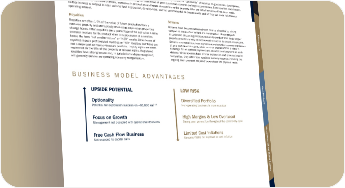 O U R B U S I N E S S M O D E L As a gold-focused royalty and streaming company, we do not operate mines, develop projects or conduct exploration. We have a unique business that is exposed to both the tremendous resource upside potential, or “optionality” of royalties on gold mines, development projects and exploration properties and the low risk, long life cash flows of precious metals streams on large copper mines. Both royalties and streams provide exposure to commodity prices, increases in production and future discoveries on the property. After our initial investment has been made, neither interest is subject to cash calls to fund exploration, development, capital, environmental or closure costs and so they are lower risk than an operating interest. Royalties Royalties are often 1-2% of the value of future production from a resource property and are typically created as exploration properties change hands. Often royalties are a percentage of the net value a mine operator receives for its product when it is processed at a smelter, hence the term “net smelter return” or “NSR” royalty. Other forms of royalties include profit-related royalties or “NPI” royalties but these are not a major part of Franco-Nevada’s portfolio. Royalty rights are often registered on the title of the property or mineral rights. Registered royalties have strong tenure and, in jurisdictions where recognized, will generally survive an operating company reorganization. Streams Streams have become a mainstream source of capital to mining companies most often to fund the construction of new projects. In particular, streaming precious metals by-product from large copper projects provides a very attractive cost of capital to project developers. Streams are metal purchase agreements where the streamer purchases all or a portion of the gold, silver or other products from a mine in exchange for an upfront payment and an additional payment on each delivery. While streams have similar exploration and price optionality to royalties, they differ from royalties in many respects including the ongoing cash payment required to purchase the physical metal. B U S I N E S S M O D E L A D V A N T A G E S UPSIDE POTENTIAL Optionality Potential for exploration success on ~66,800 km 2 (1) Focus on Growth Management not occupied with operational decisions Free Cash Flow Business Not exposed to capital calls LOW RISK Diversified Portfolio Non-operating business is more scalable High Margins & Low Overhead Strong cash generation throughout the commodity cycle Limited Cost Inflations Streams/NSRs not exposed to cost inflation 1 Cobre Panama currently on preservation and safe management Franco-Nevada Corporation ★ 7 TSX / NYSE: FNV Overview